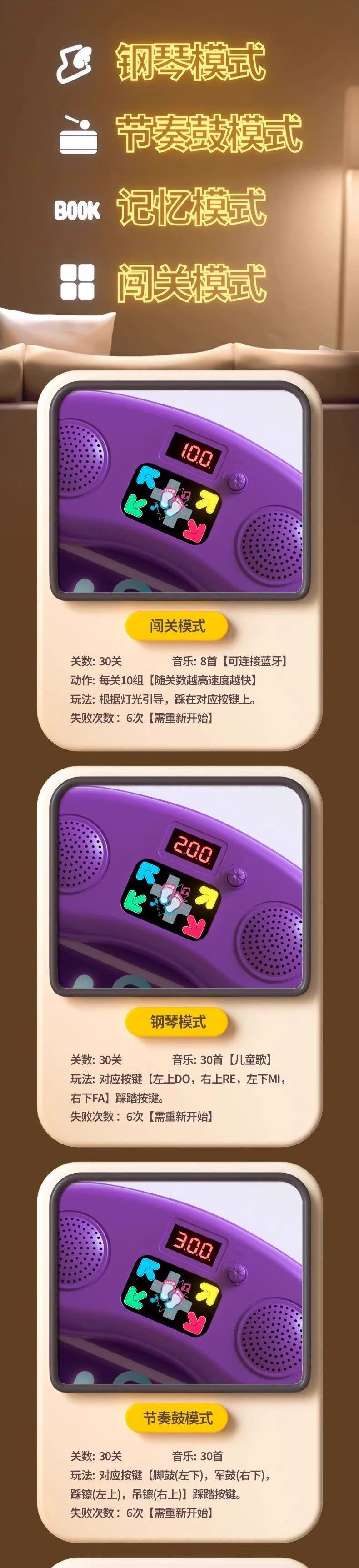 • 뮤직 댄스 매트 - 리튬 배터리 모델 [다양한 엔터테인먼트 모드] - 다양한 플레이 모드 [레벨/메모리/리듬/피아노]