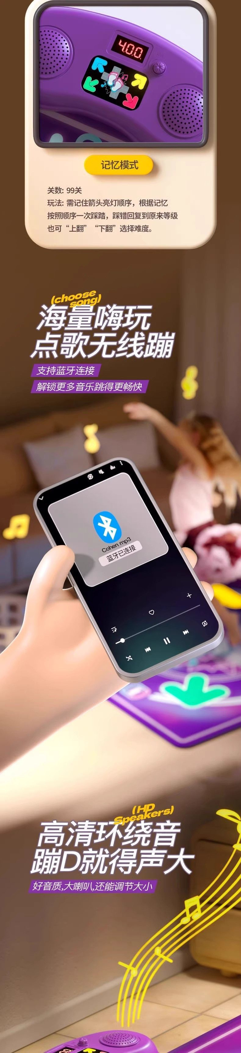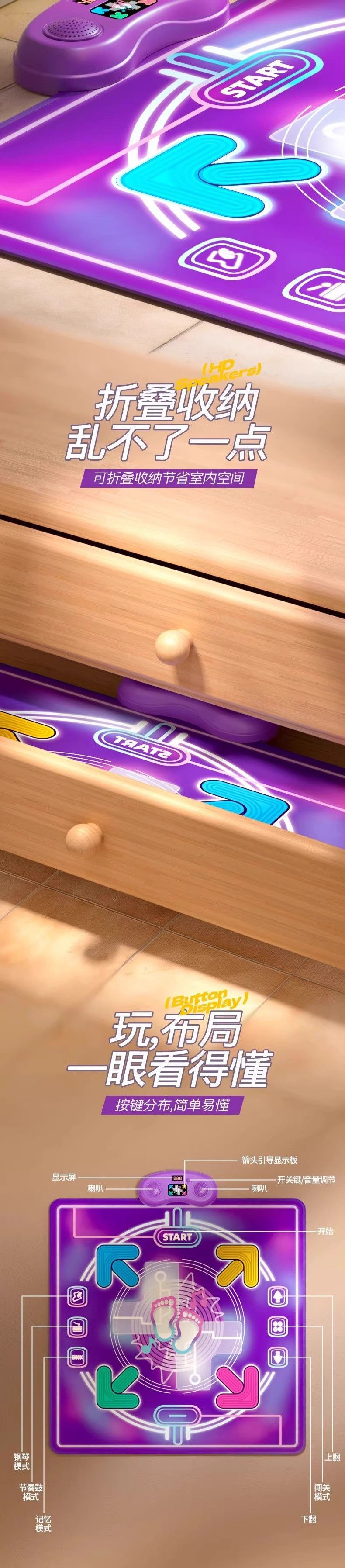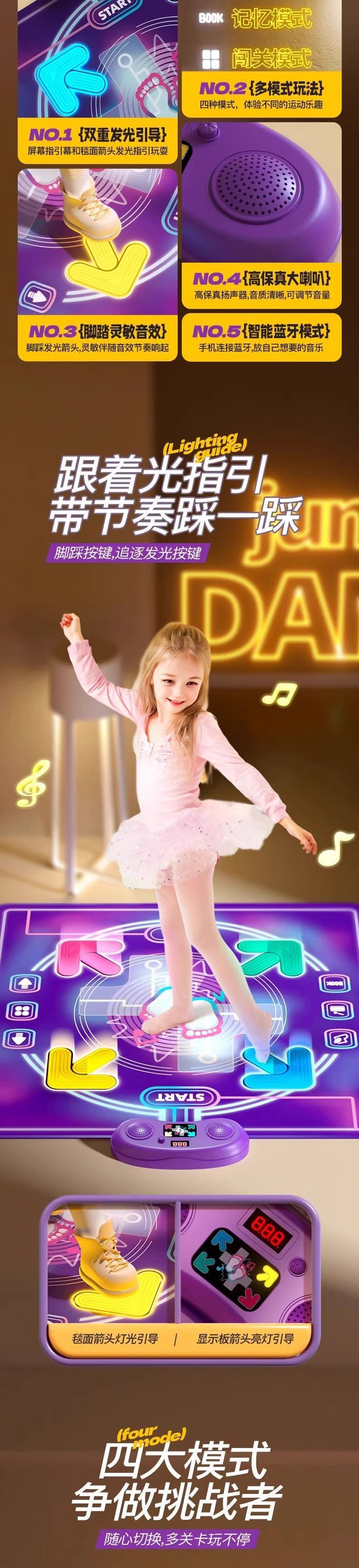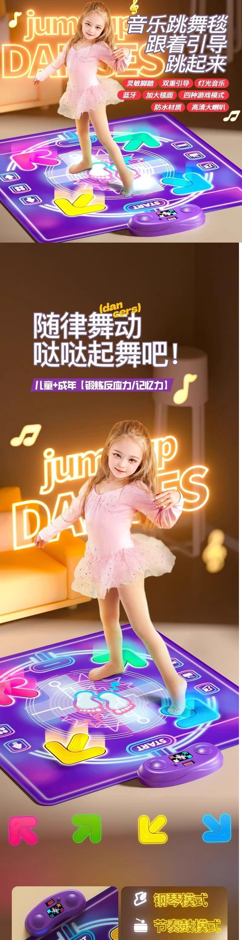 • 듀얼 리튬 배터리 모델 - 뮤직 댄스 매트 [다양한 엔터테인먼트 모드] - 다양한 플레이 모드 [레벨/메모리/리듬/피아노]