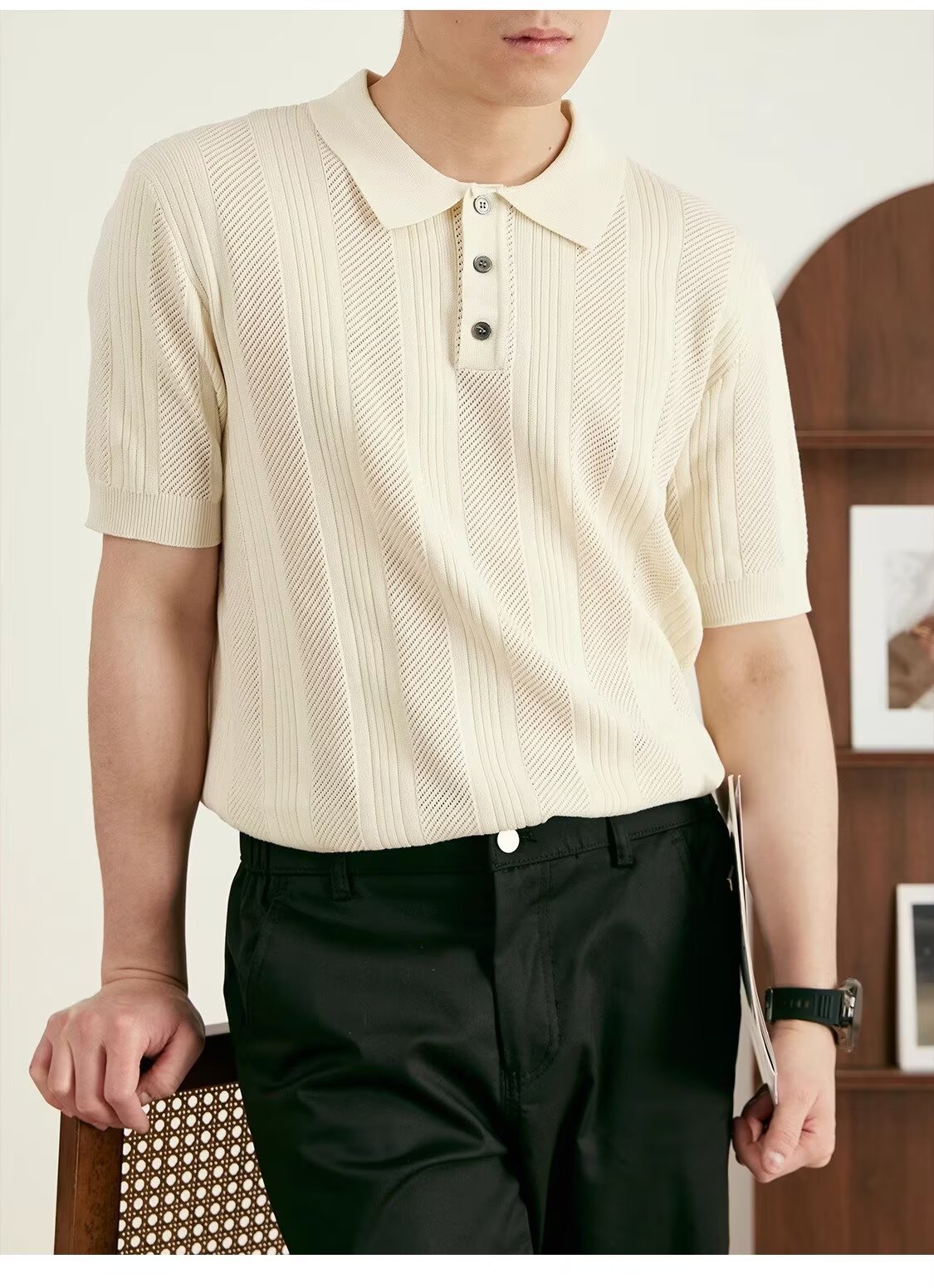 아메리칸 레트로 남성 여름 틈새 중공 라펠 니트 폴로 셔츠 패셔너블 캐주얼 쿨 반팔 남성 티셔츠