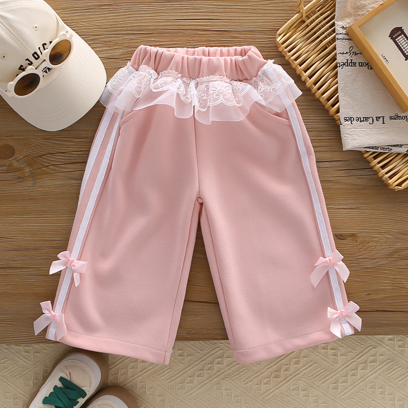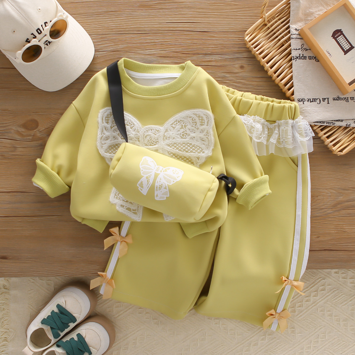 세련된 소녀 가을 의류 2025 봄과 가을 새로운 아기 레이스 보우 정장 어린이 가방 스웨트 투피스 세트
