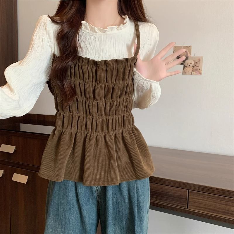 여성을 위한 틈새 프렌치 하이엔드 페이크 투피스 셔츠, 봄, 가을 뚱뚱한 허리 커버 배 슬리밍 짧은 베이비돌 셔츠 탑스토어 가기