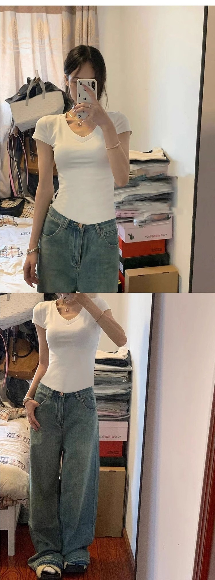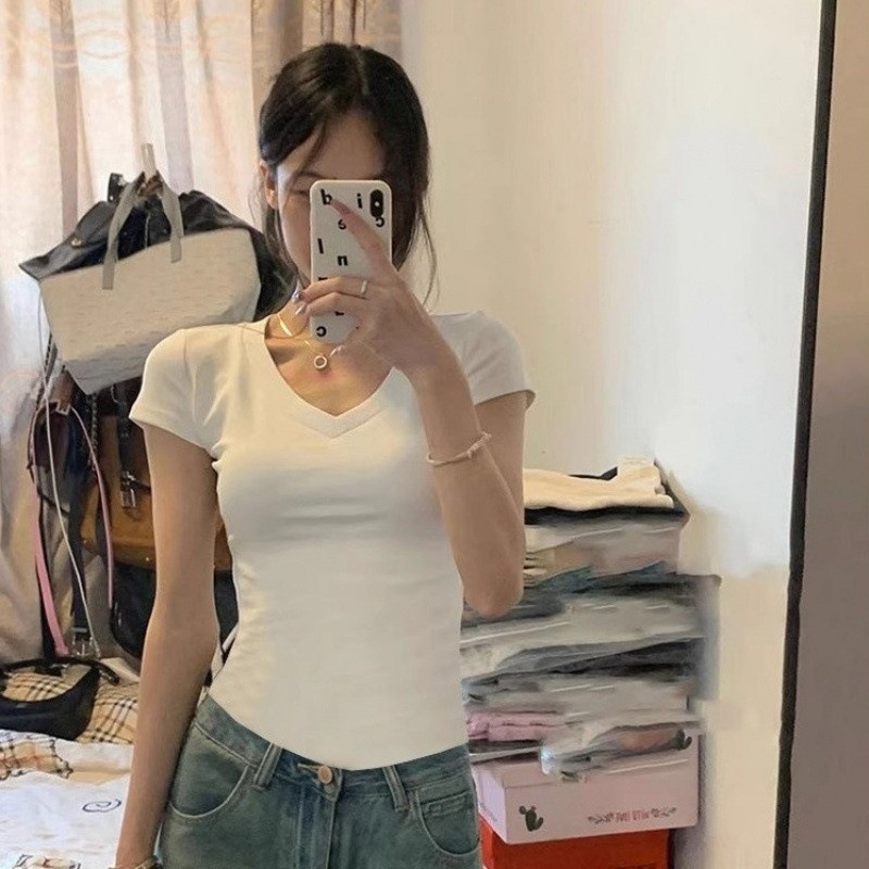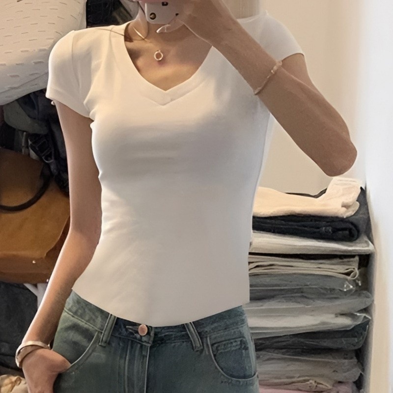 여성용 화이트 오른쪽 어깨 브이넥 반팔 티셔츠, 하이엔드 슬리밍 쇄골 사이드 플리츠 패셔너블하고 스타일리시한 바텀탑스토어 가기