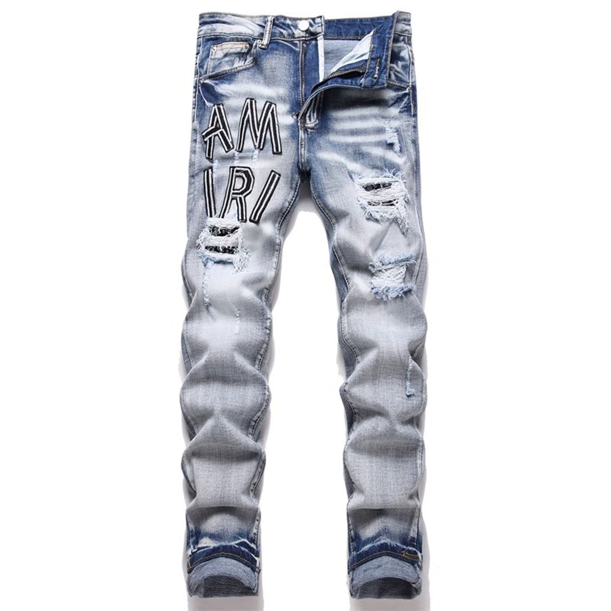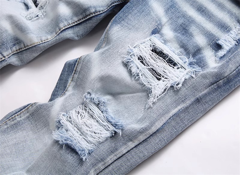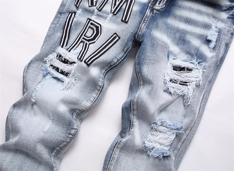 트렌디 브랜드 패치 찢어진 패치 청바지 남성 트렌디 인터넷 연예인 맞춤형 자수 슬림핏 스트레치 스트레이트 팬츠