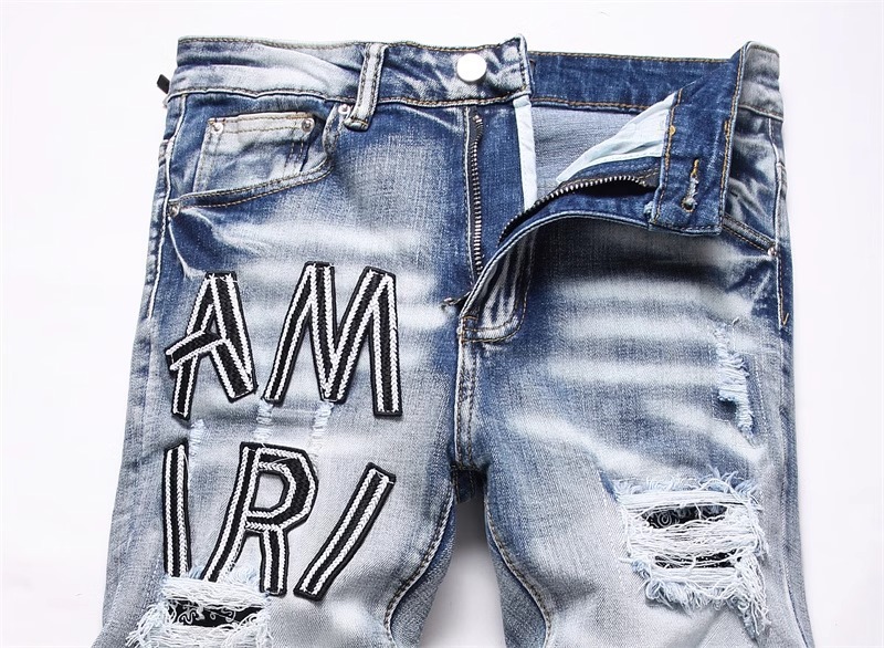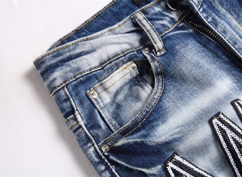 트렌디 브랜드 패치 찢어진 패치 청바지 남성 트렌디 인터넷 연예인 맞춤형 자수 슬림핏 스트레치 스트레이트 팬츠스토어 가기