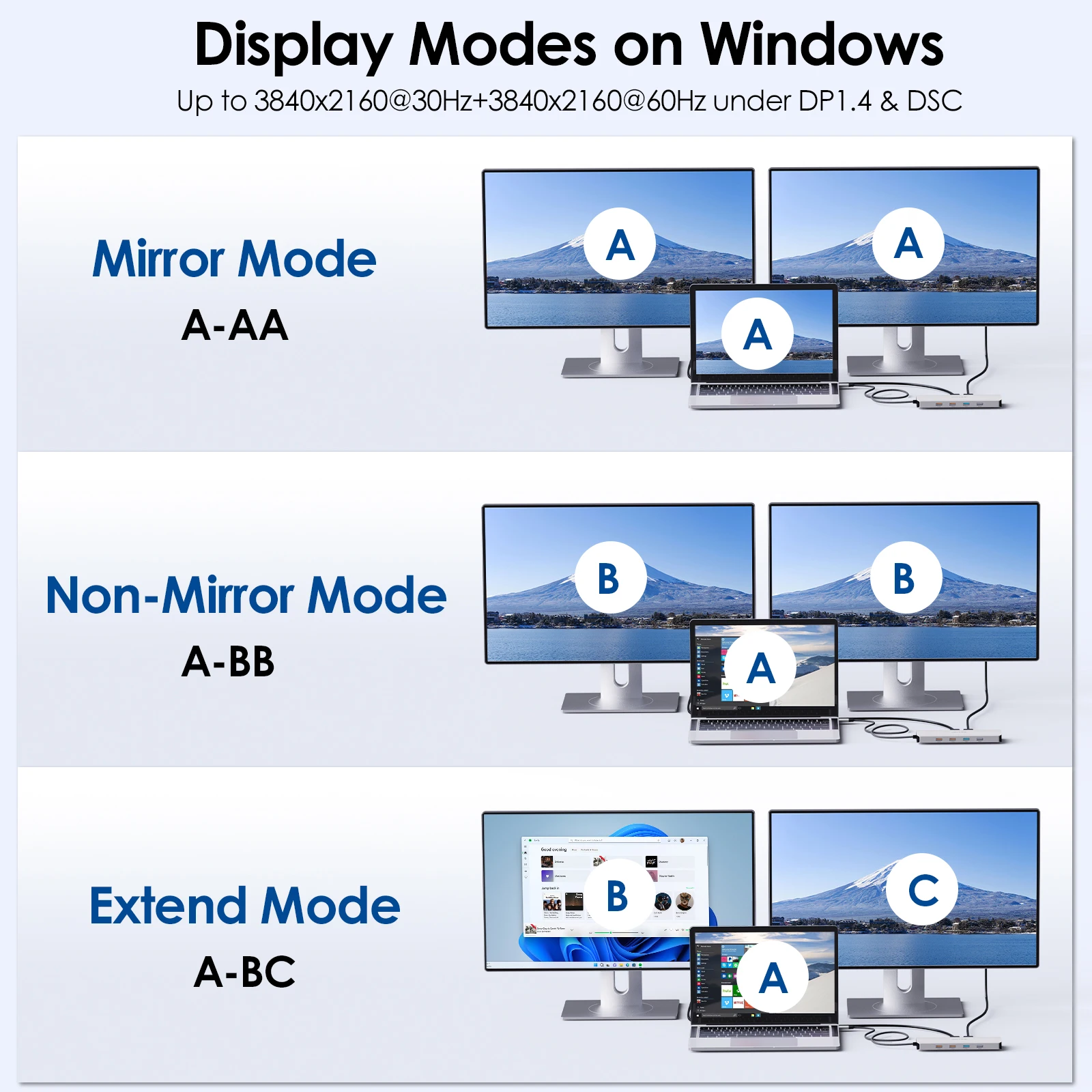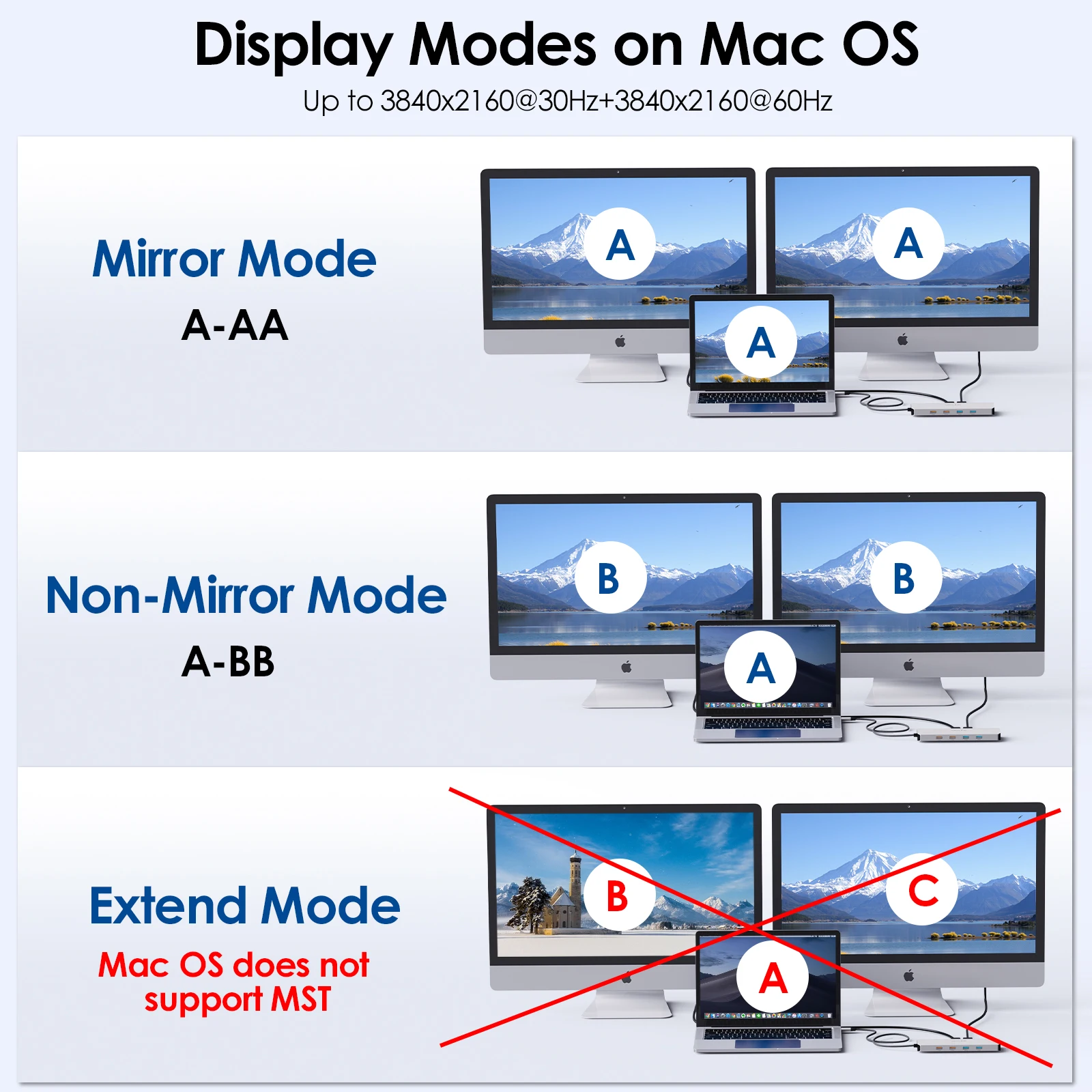 Windows扩展到两个不同的屏幕(ABC) Mac扩展到一个不同的屏幕,同时在其他屏幕上镜像内容(ABB)。