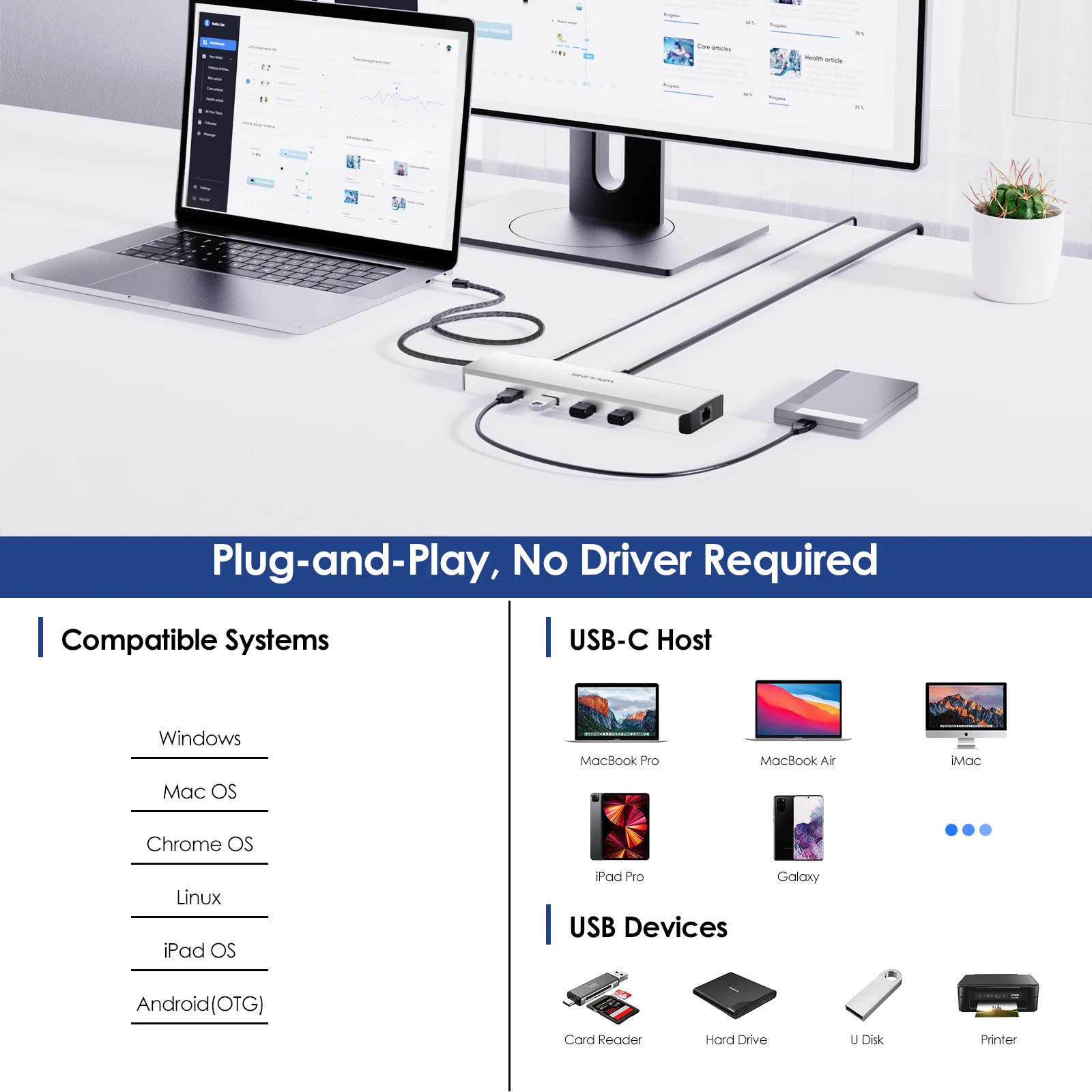 接口:1个USB-C(PD IN, 100W), 1个USB-C 3.2(10Gbps), HDMI1 (4K@30Hz), HDMI2 (4K@60Hz), 1个千兆RJ45, 2xUSB-A 3.2(10Gbps), 2xUSB-A 3.0(5Gbps), USB2.0(480Mbps)