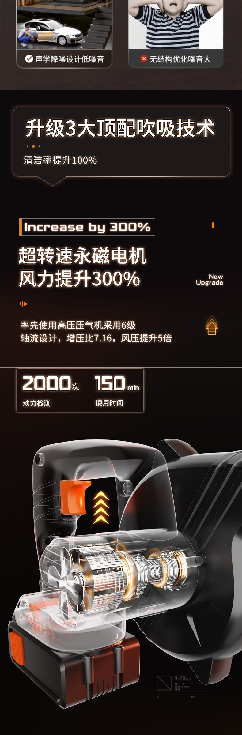 • 강력한 [풍속 80% 증가] 무단계 속도 조절 + 진공청소기 세트 [양면 임펠러]★더 큰 풍량]