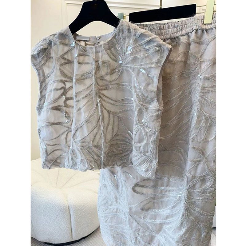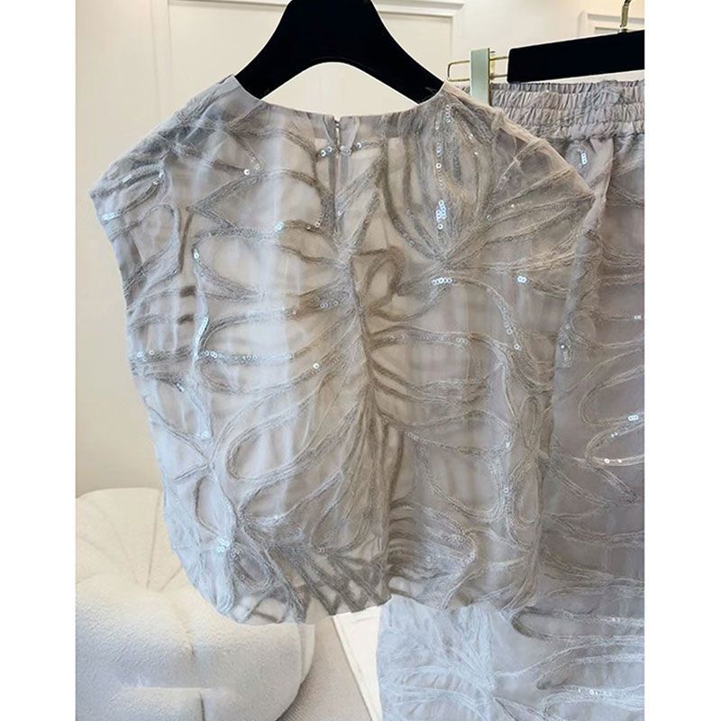디자인 플라워 스팽글 루즈 탱크탑 탑 신축성 있는 허리 슬리밍 백 슬릿 스트레이트 스커트 롱 슈트 여름스토어 가기