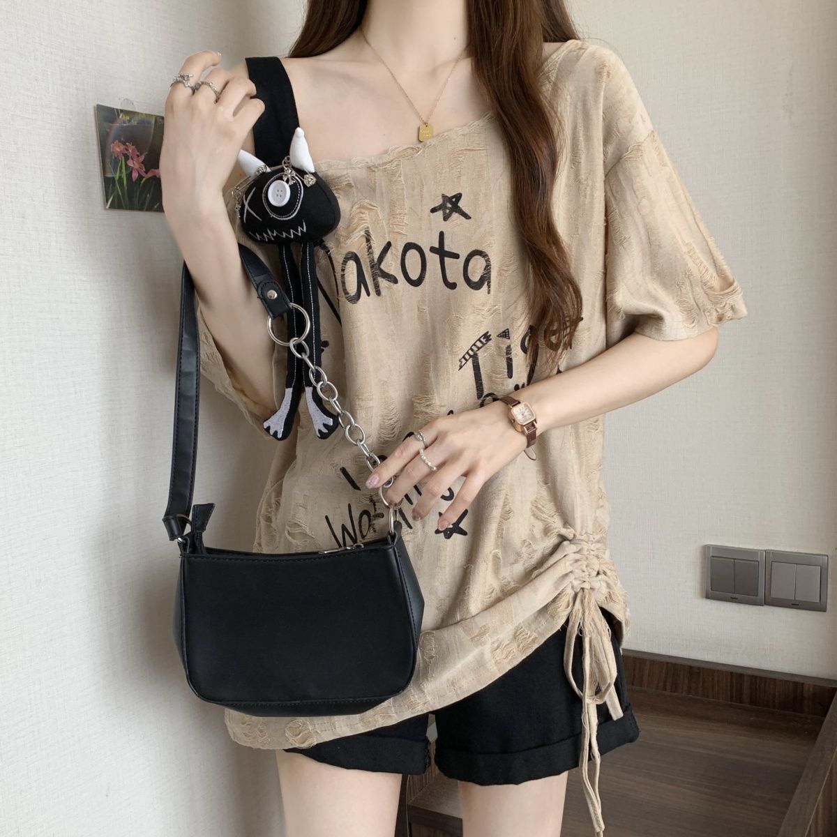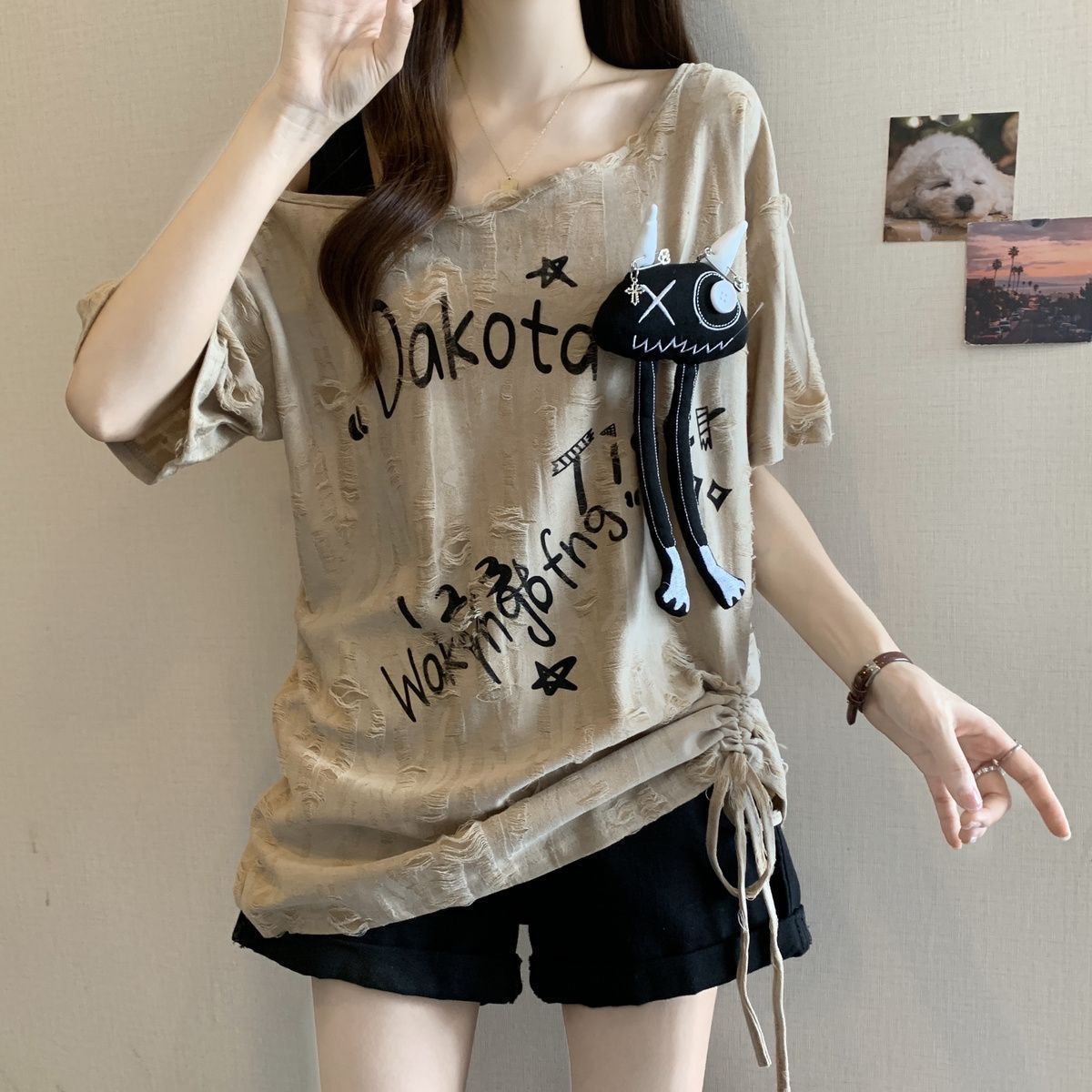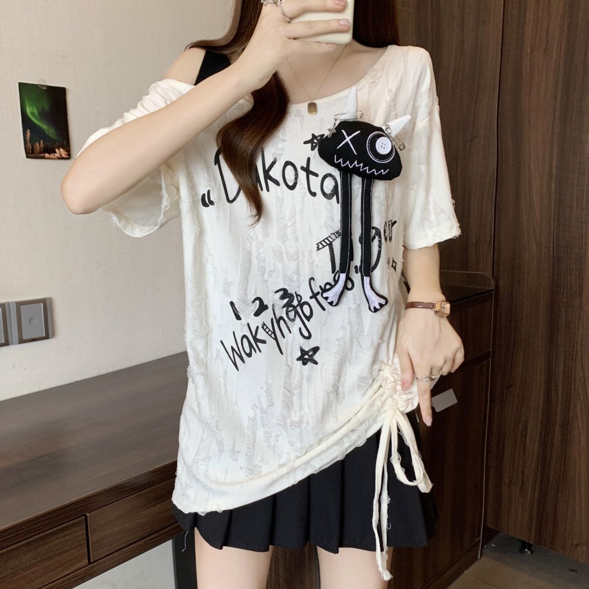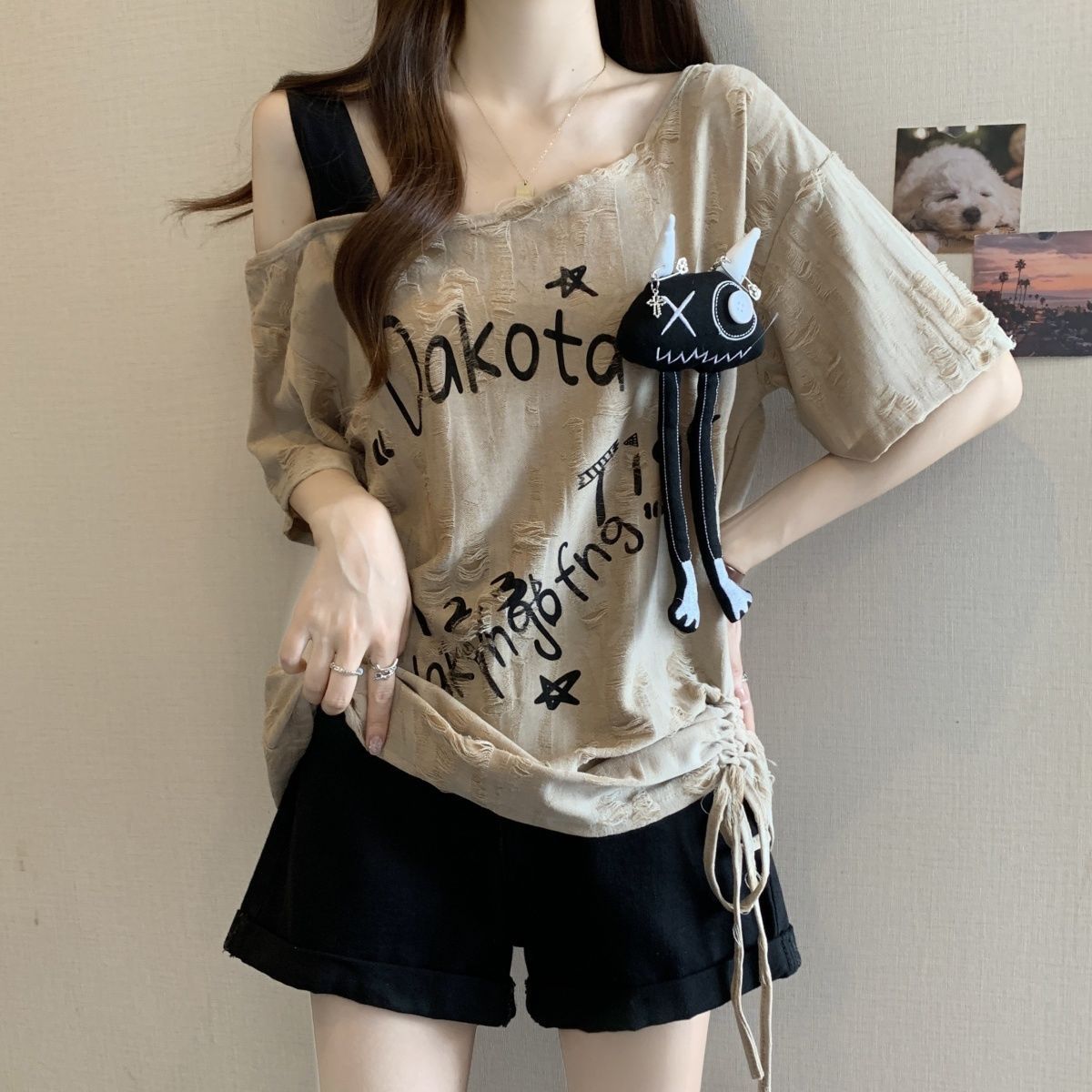 플러스 사이즈 찢어진 드로스트링 플리츠 오프 숄더 반팔 티셔츠 여성용 여름 신작 뚱뚱한 mm 루즈 슬리밍 바디 커버 슬래시 넥 탑