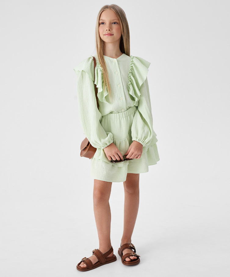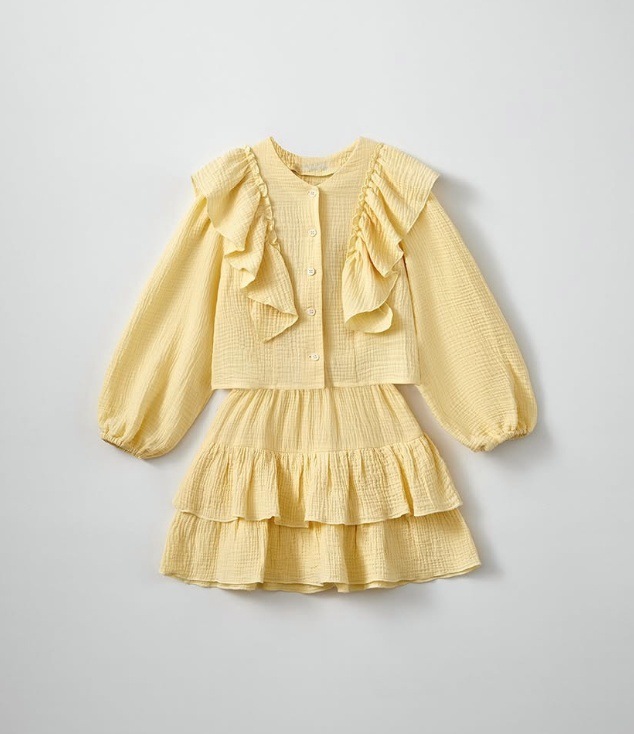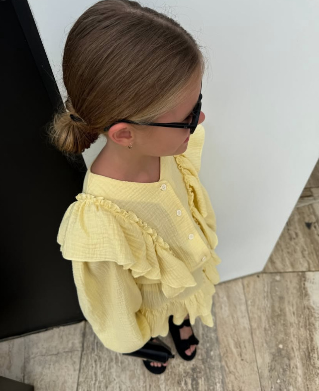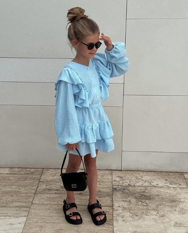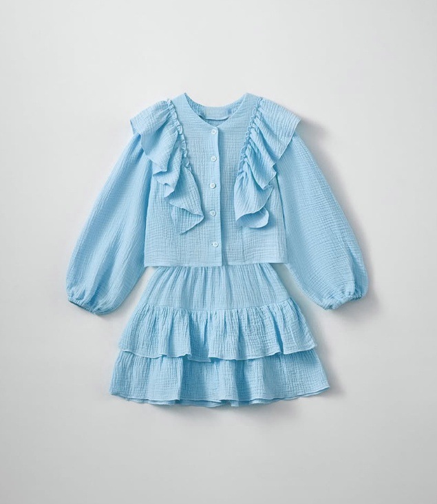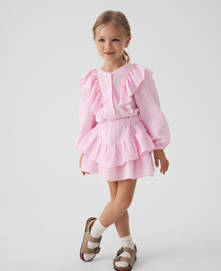 2025 ins 러시아 소녀 봄, 가을 코튼 플라잉 숄더 슬리브 셔츠 + 레이스 스커트 영국 어린이 투피스 세트스토어 가기