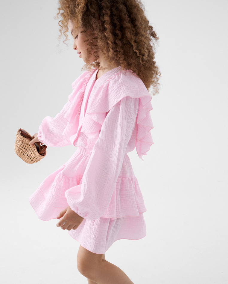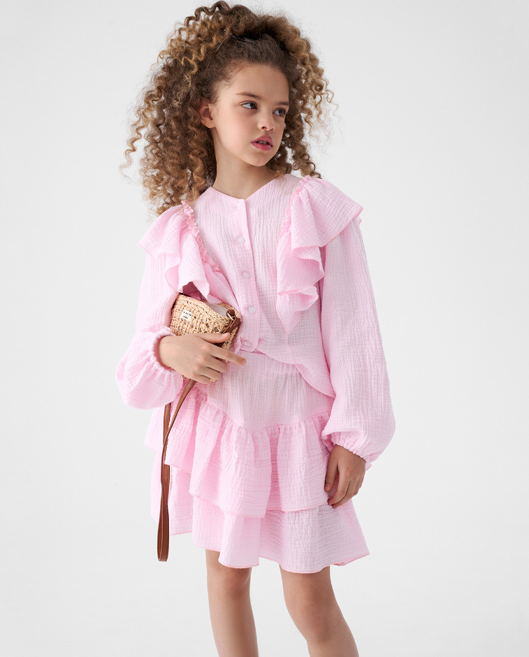 2025 ins 러시아 소녀 봄, 가을 코튼 플라잉 숄더 슬리브 셔츠 + 레이스 스커트 영국 어린이 투피스 세트
