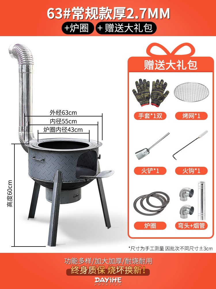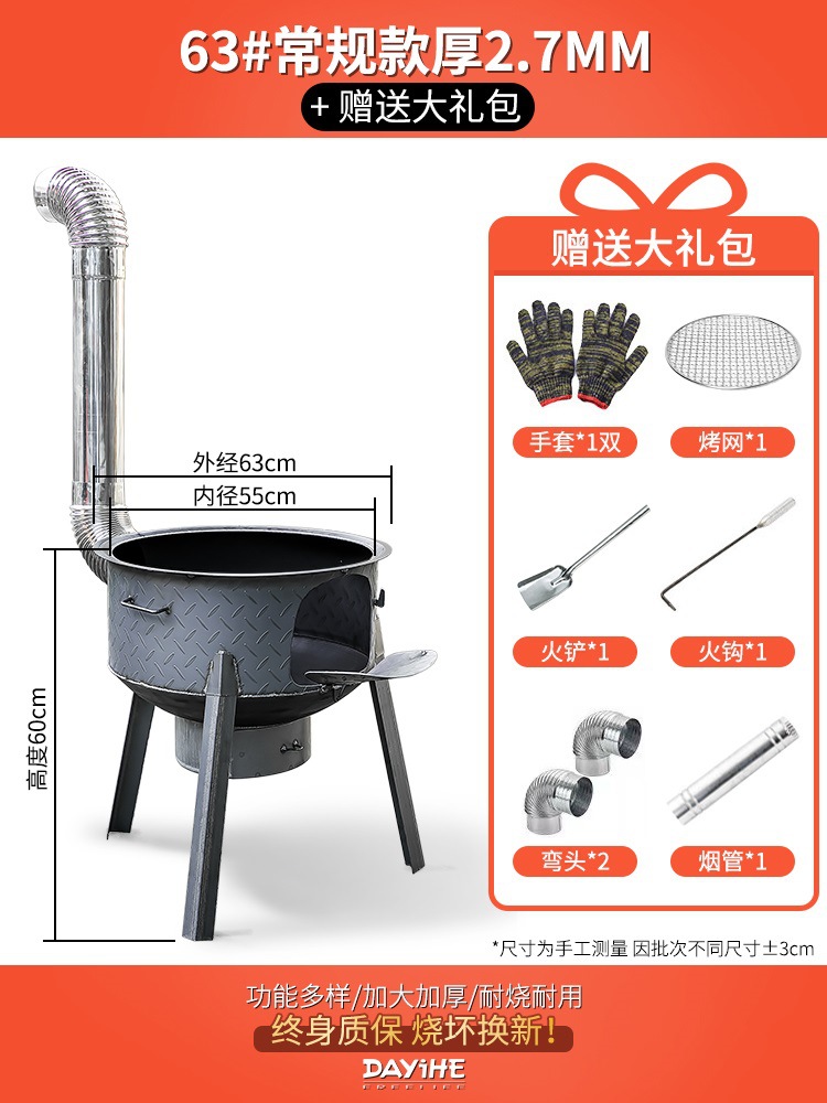 • [클래식 대형 화로] [두꺼운 2.2 패턴 강철] 63CM + [냄비 포함 풀 세트] [스테인리스 굴뚝]