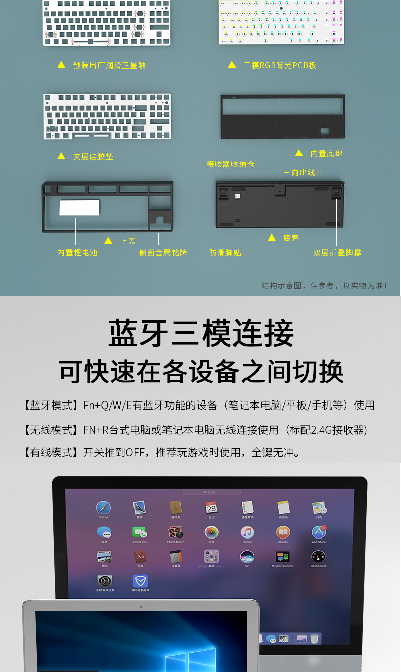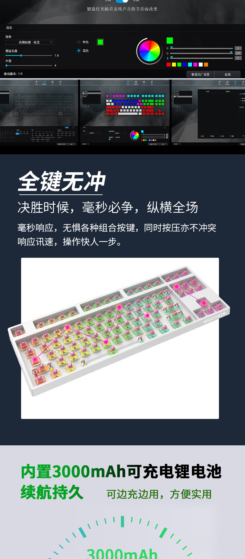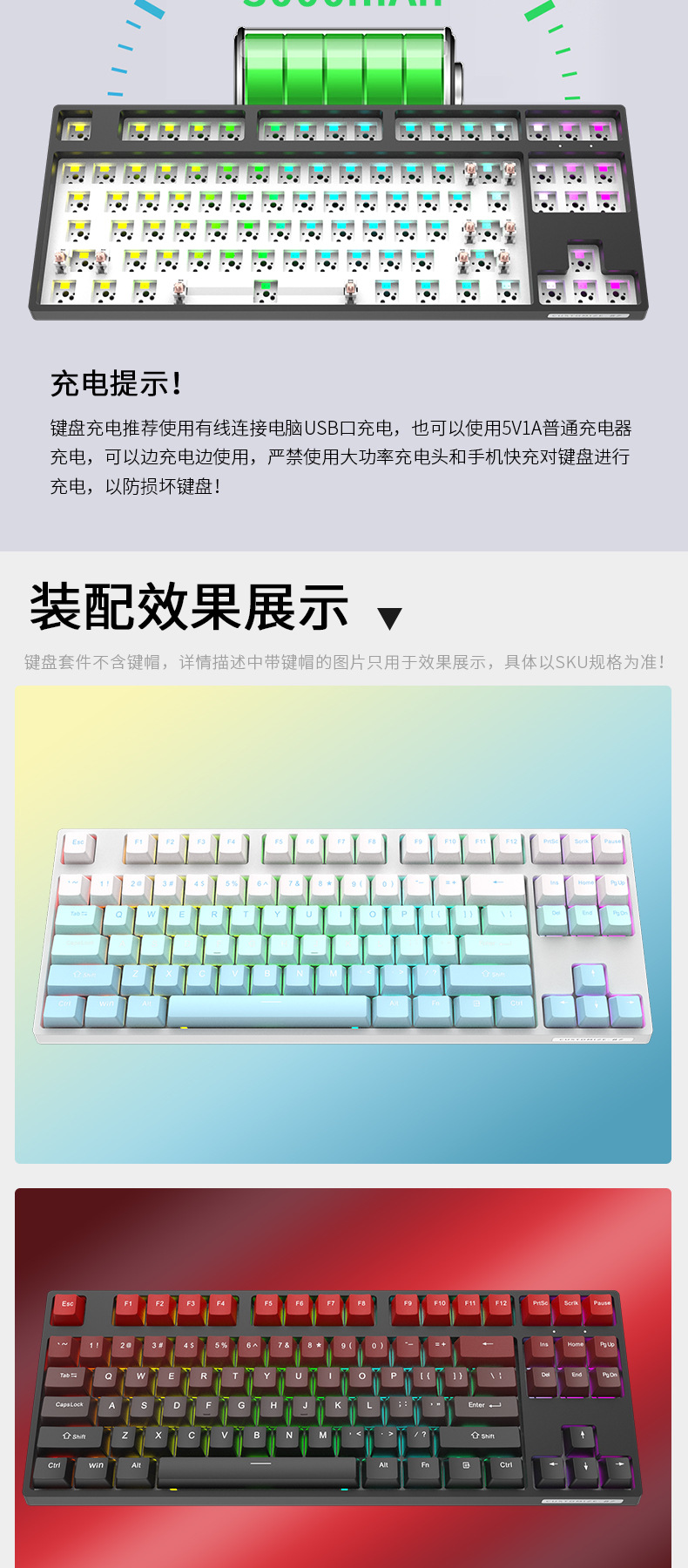温馨提示:请只用键盘原配充电线连接电脑充电,勿连接手机充电器、充电宝或是其它快充设备充电,以免损坏键盘!此操作不在保修范围内。