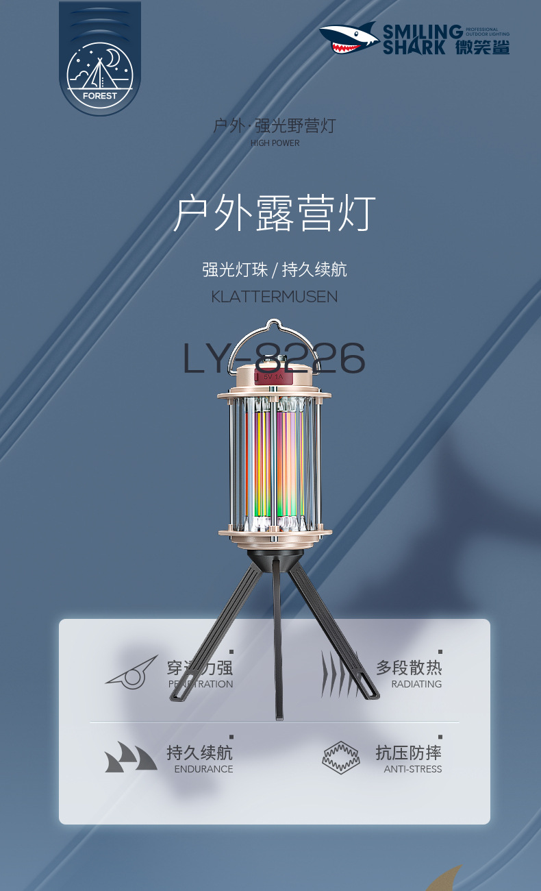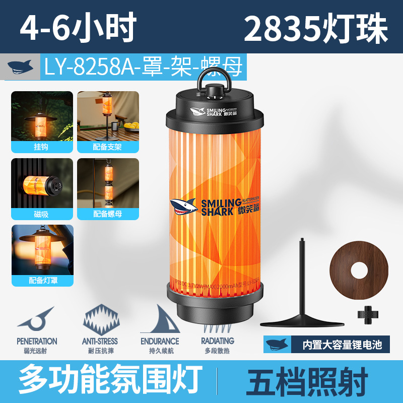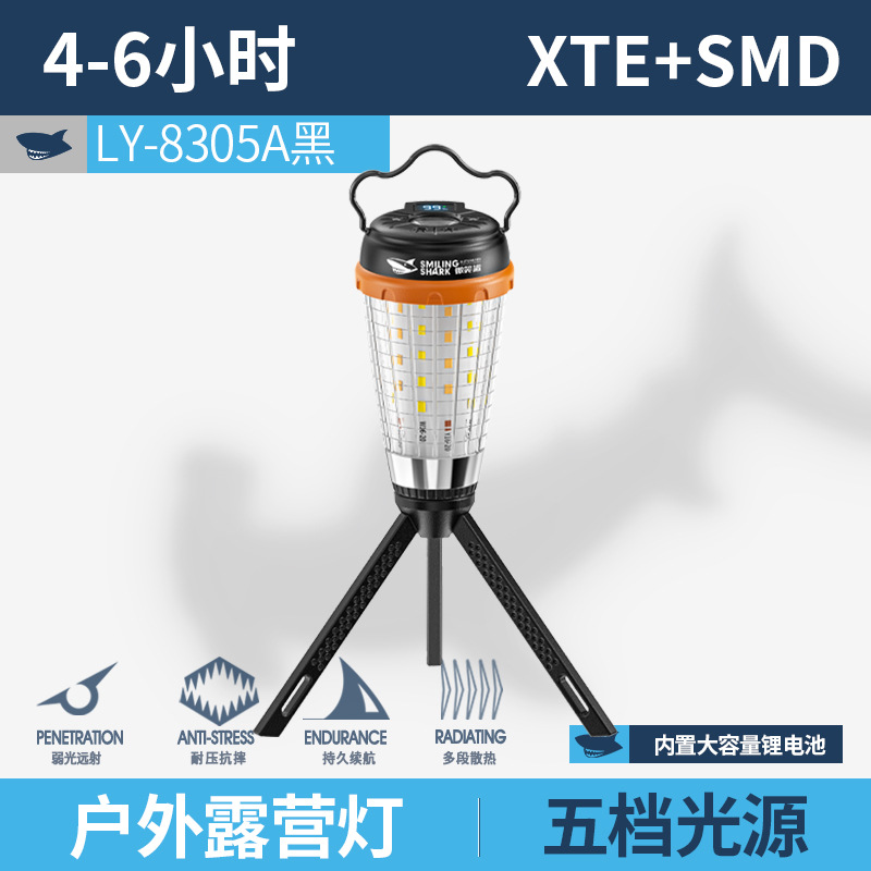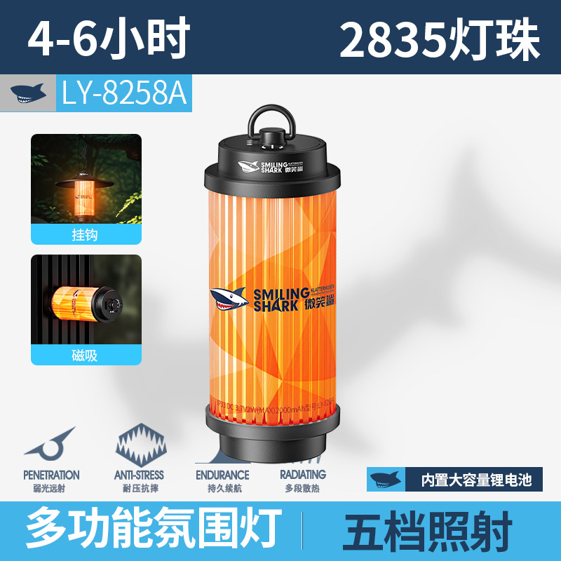 국경 간 새로운 스마일 상어 다기능 야외 조명 캠핑 램프 텐트 램프 긴 배터리 수명 USB 충전식 휴대용