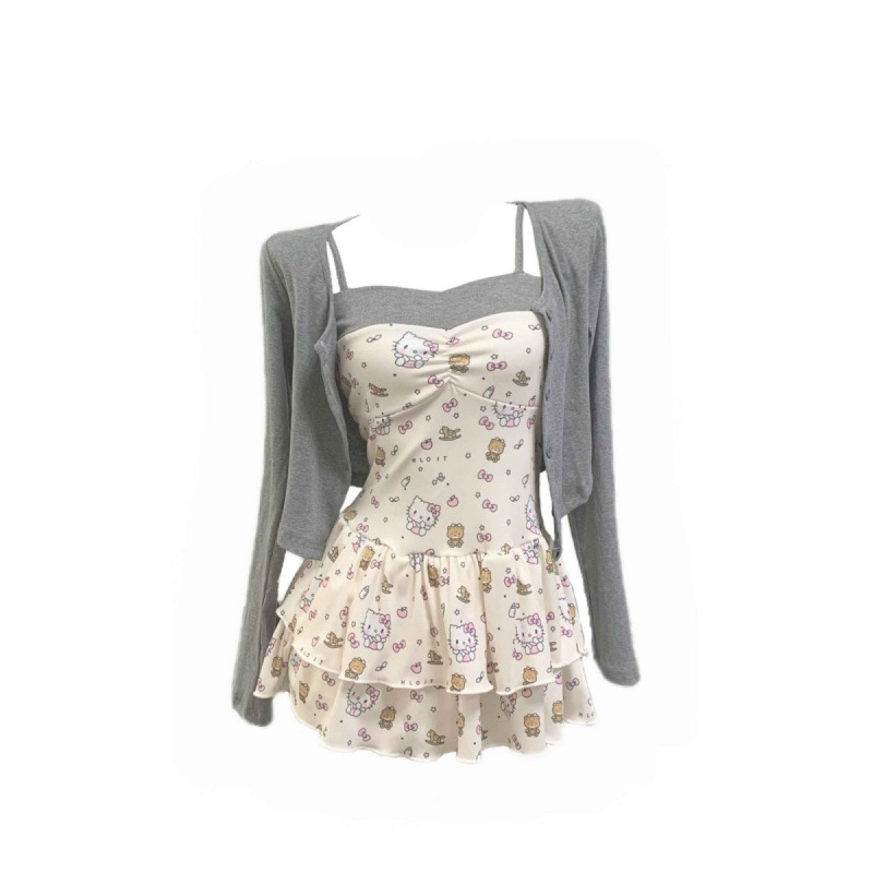 • 투피스 그레이 가디건 + 고양이 프린트 서스펜더 스커트