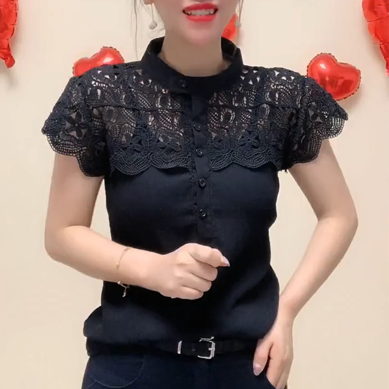 여성용 여름 중공 레이스 탑, 살짝 비치는 반팔 쉬폰 셔츠, 빅사이즈 뚱뚱한 배 커버, 패셔너블한 셔츠, 반팔 셔츠