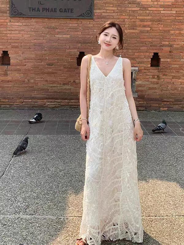 여름 아름다운 스커트 프렌치 하이엔드 스타일 해변 휴가 헤비 화이트 브이넥 민소매 드레스