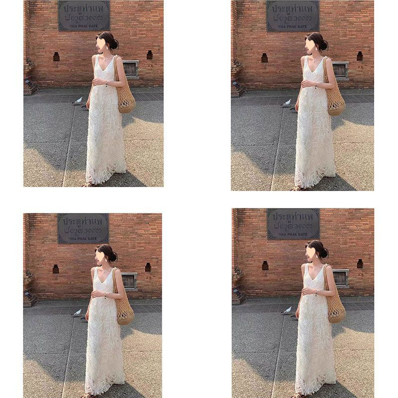 여름 아름다운 스커트 프렌치 하이엔드 스타일 해변 휴가 헤비 화이트 브이넥 민소매 드레스스토어 가기