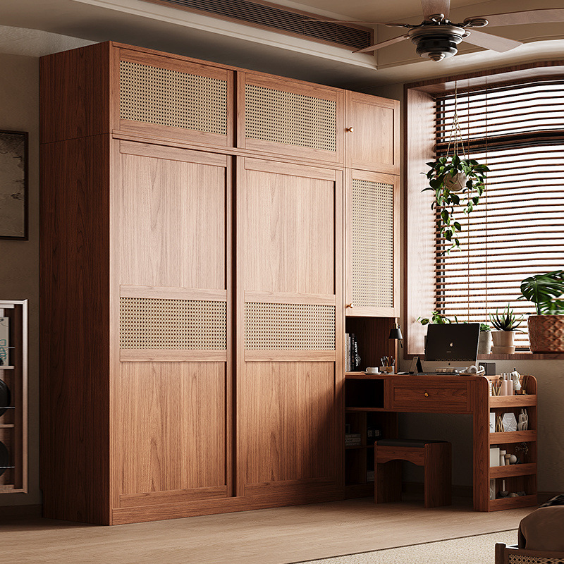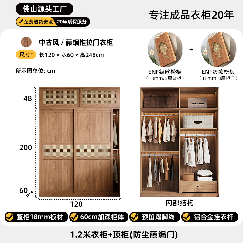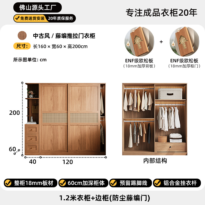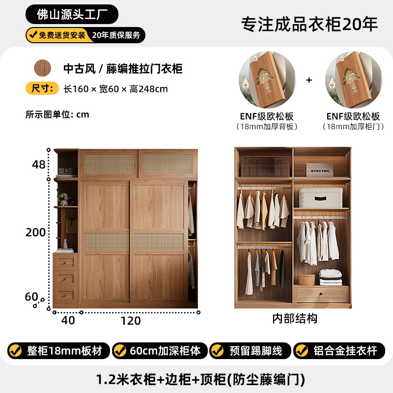 등나무로 짠 중세 스타일 슬라이딩 도어 옷장 작은 가정용 침실 보관 캐비닛 슬라이딩 도어 유럽 소나무 판자 옷장