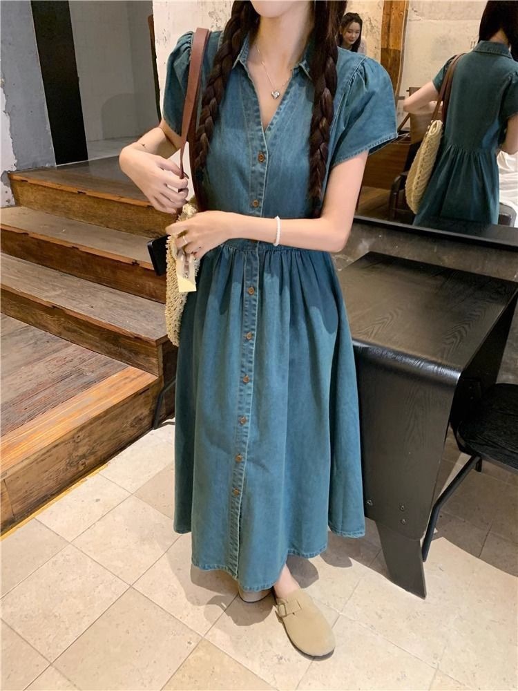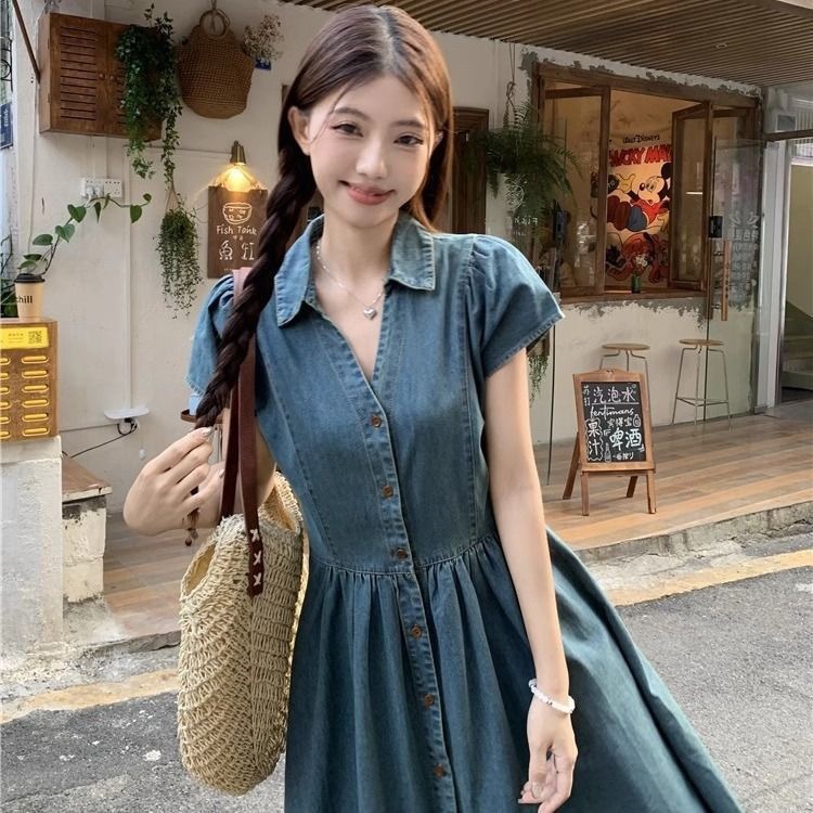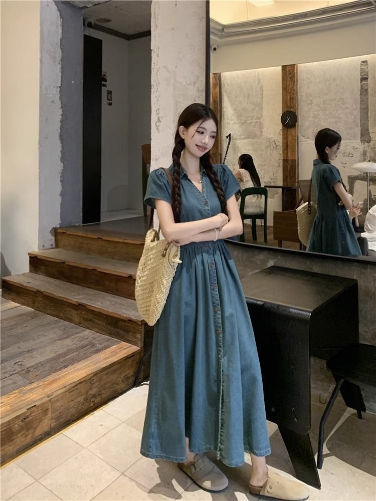 여름 여성을 위한 플러스 사이즈 복고풍 반팔 드레스, 허리 슬리밍 데님 롱 스커트, 뚱뚱한 소녀를 위한 틈새 디자인 셔츠 스커트스토어 가기