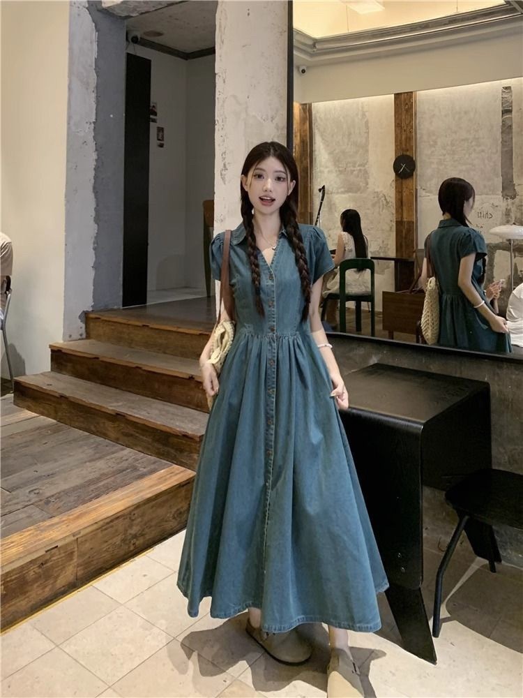여름 여성을 위한 플러스 사이즈 복고풍 반팔 드레스, 허리 슬리밍 데님 롱 스커트, 뚱뚱한 소녀를 위한 틈새 디자인 셔츠 스커트