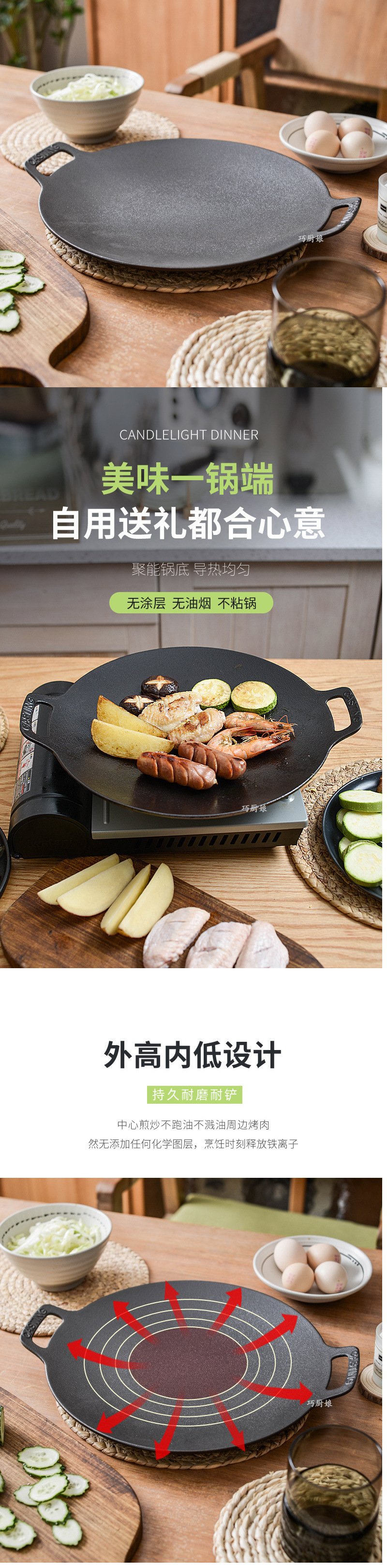 • 직경 37cm 주철 베이킹 팬 - 단일 냄비에는 화상 방지 대마 로프가 함께 제공됩니다.