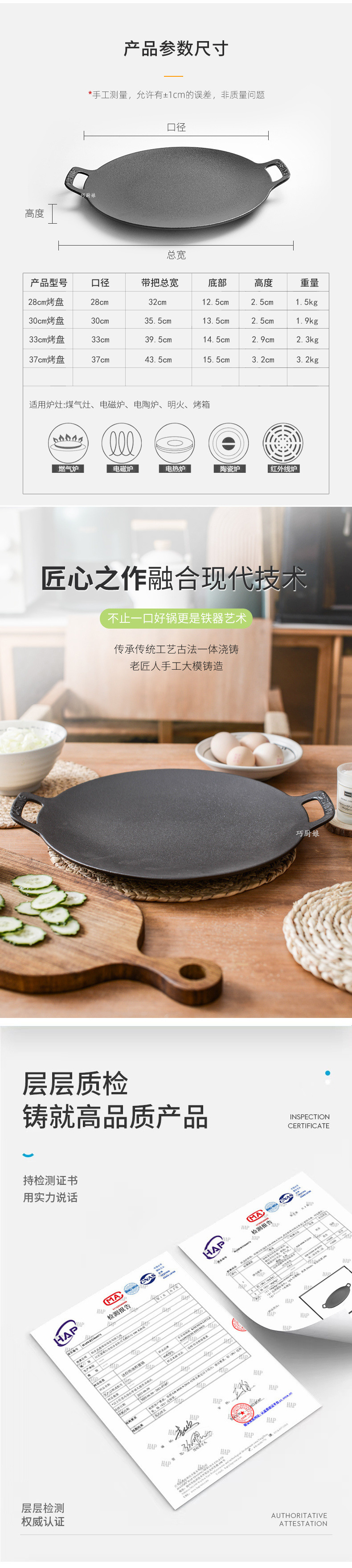 • 직경 37cm 주철 베이킹 팬 - 단일 냄비에는 화상 방지 대마 로프/클립/오일 브러시가 함께 제공됩니다.