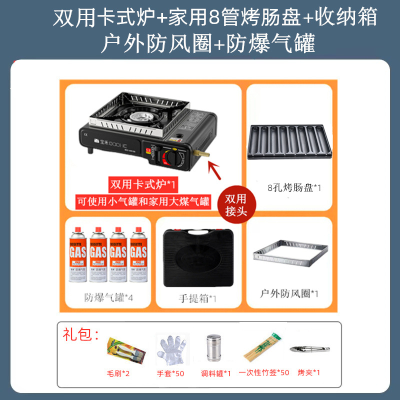 • 야외 필수 알루미늄 합금 [8관 소시지 팬] - 두꺼운 버전 [오일 탱크 포함] + 이중 용도 스토브 + 가스 4개 + 선물 가방