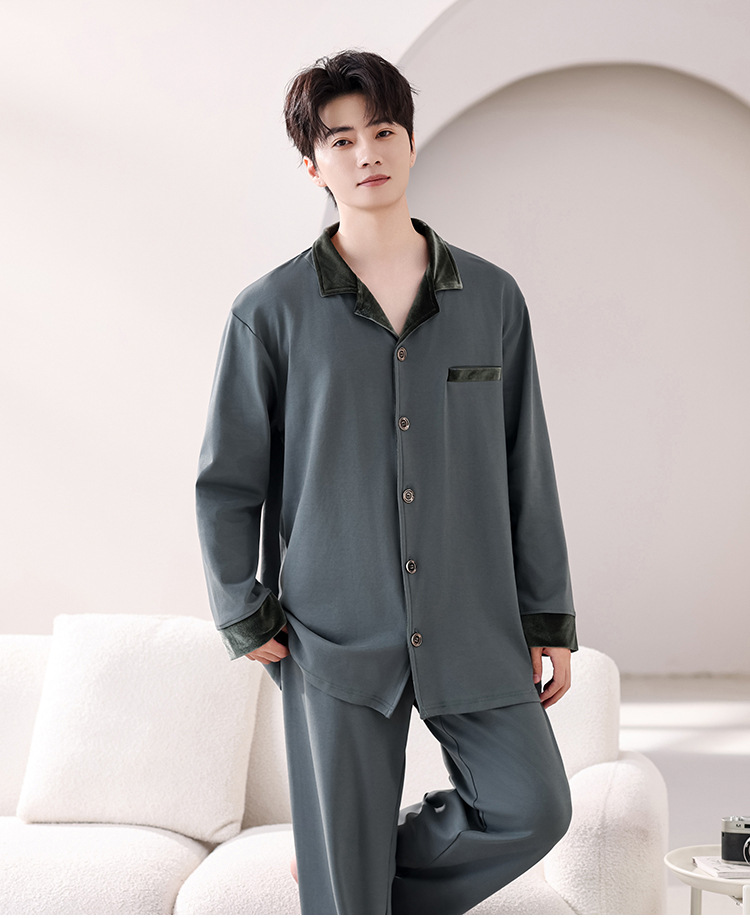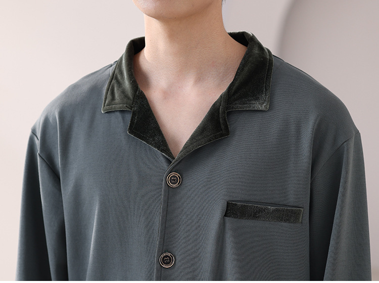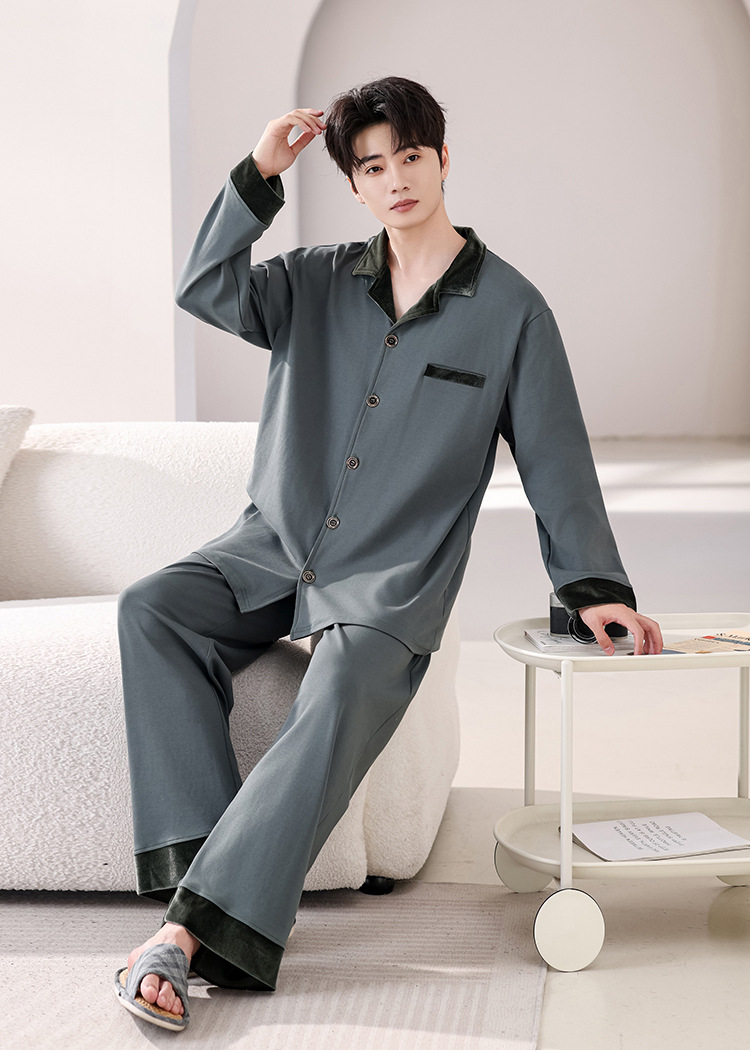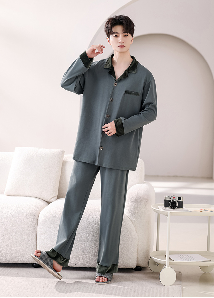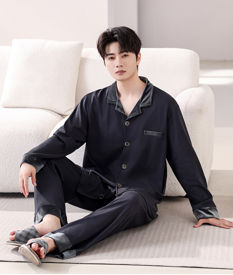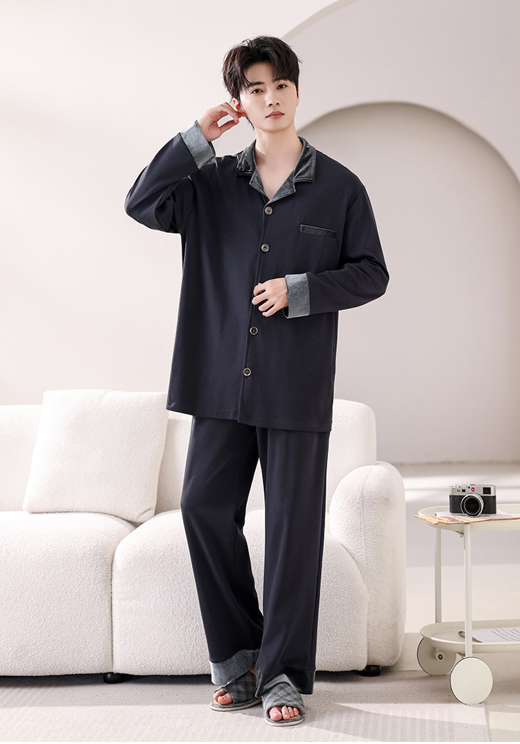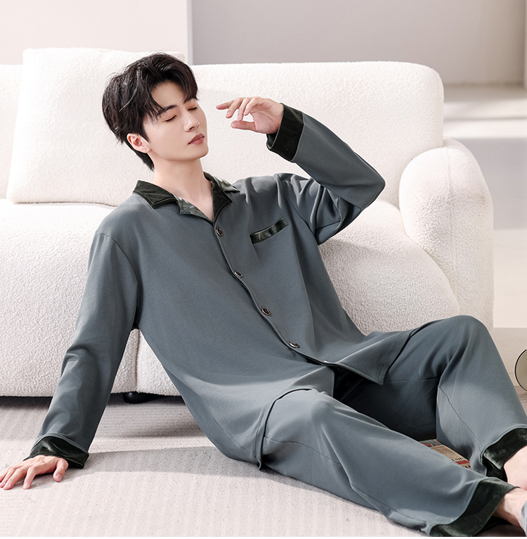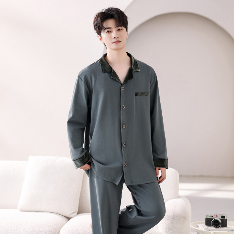 봄과 가을 남성 플러스 사이즈 잠옷 2025 새로운 느슨한 옷깃 홈웨어 솔리드 컬러 긴팔 솔리드 컬러 슈트스토어 가기