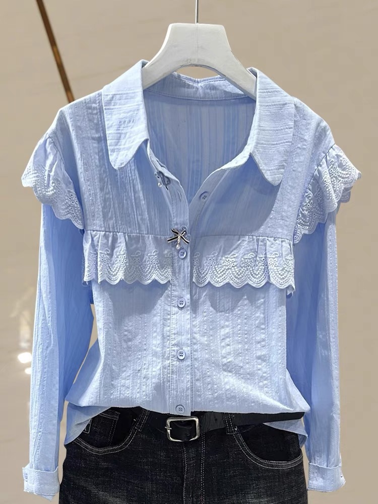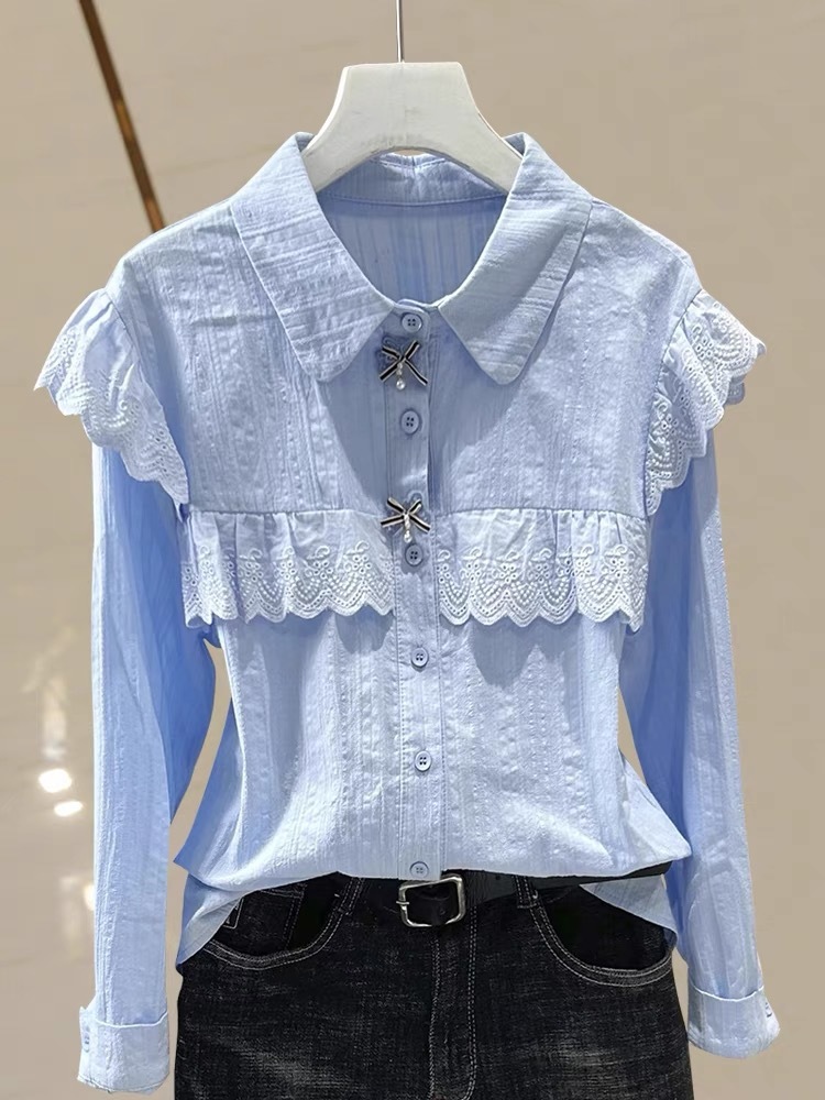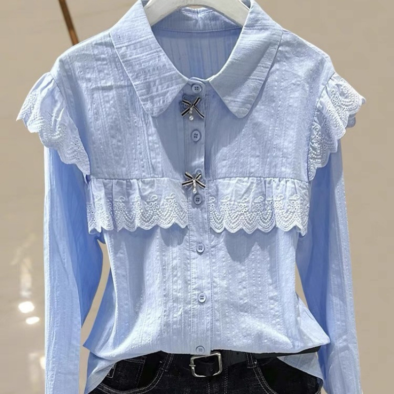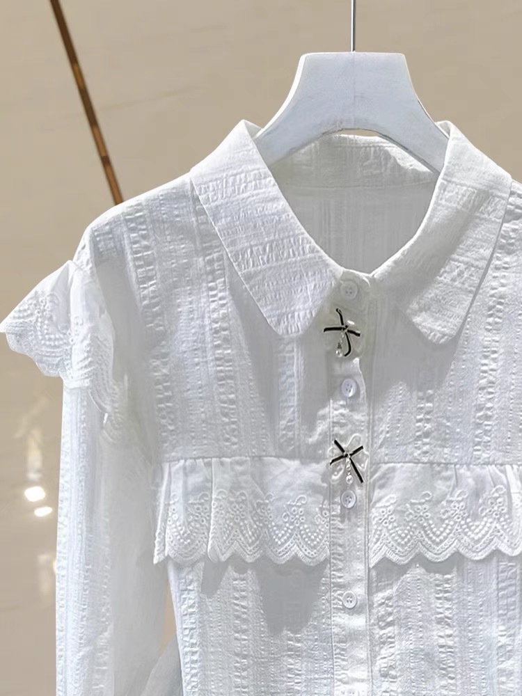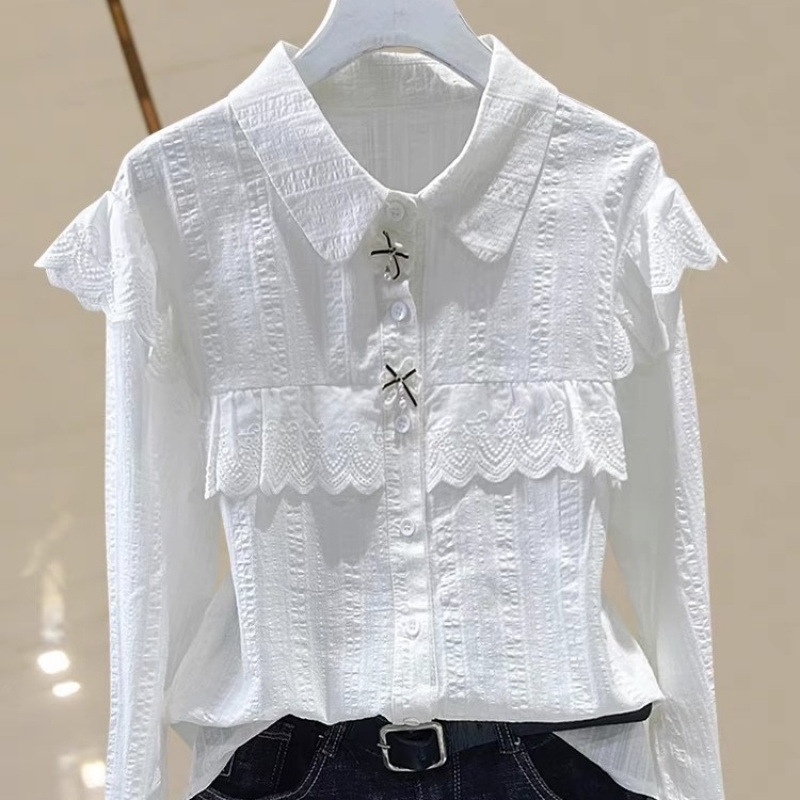 레이스 인형 칼라 봄, 가을 새로운 스타일 2024 배를 덮는 바닥 셔츠 작은 여성을위한 긴팔 쉬폰 셔츠스토어 가기