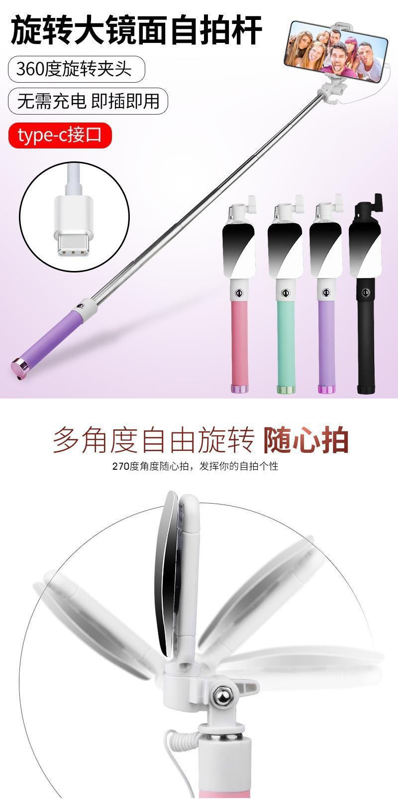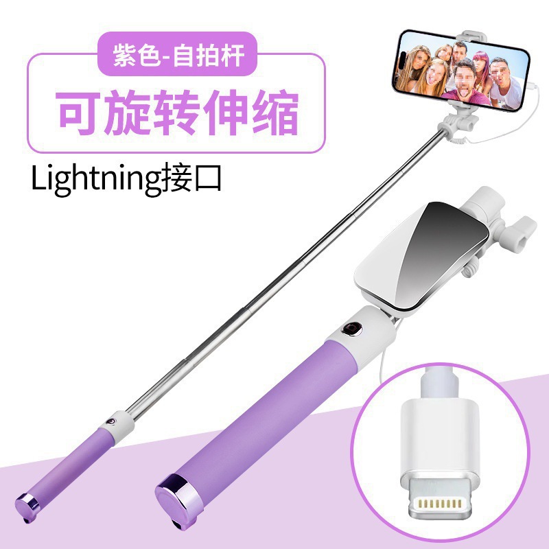 • [둥근 구멍 헤드폰 잭] 셀카봉 [회전 거울] 보라색—