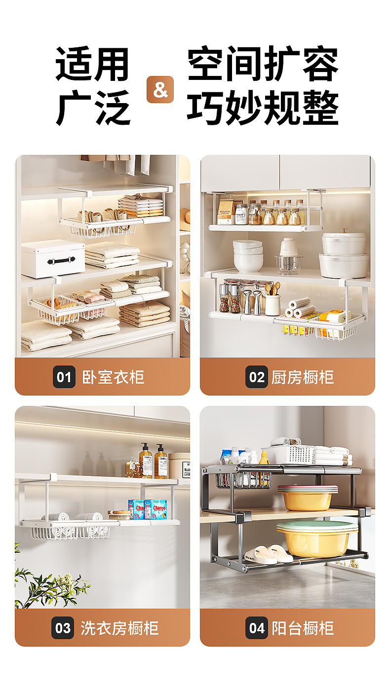 엄선된 조미료 보관 선반, 주방 수납용, 확장 가능한 걸이형 바구니, 캐비닛 내 무타공 하단 걸이형 선반, 다층 선반