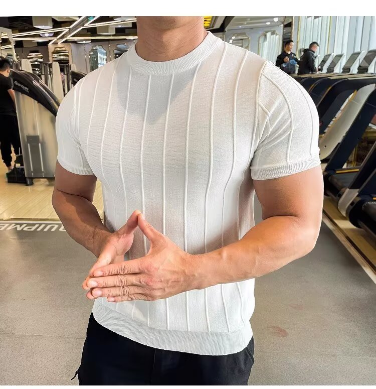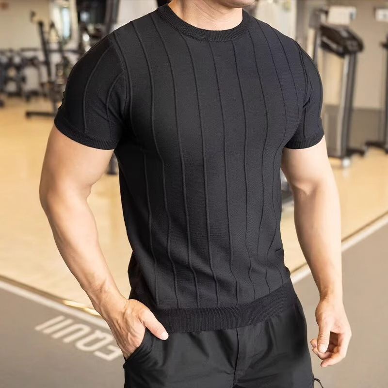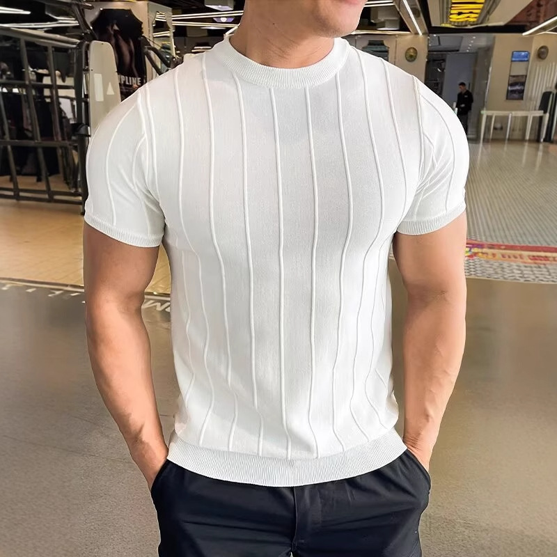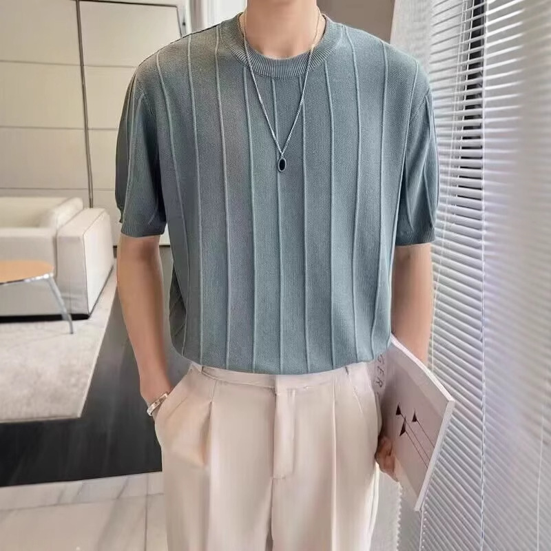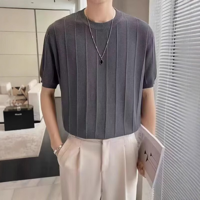 가벼운 성숙한 스타일 아이스 실크 스트라이프 라운드 넥 니트 반팔 남성 여름 얇은 하이 엔드 통근 캐주얼 오른쪽 어깨 티셔츠