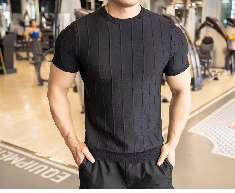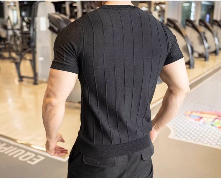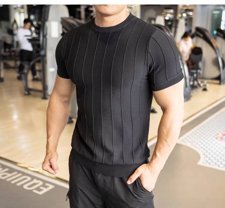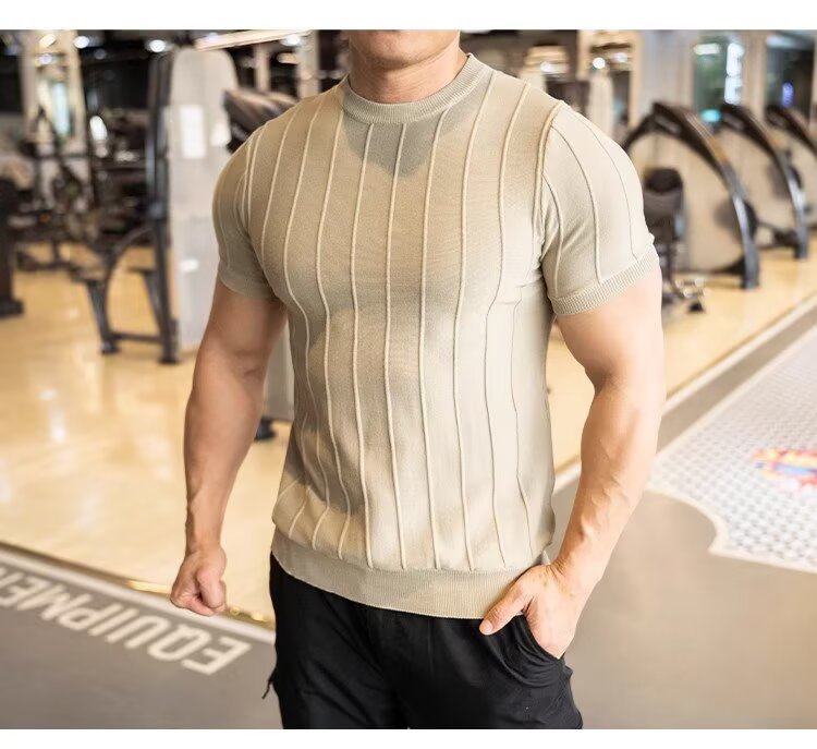 가벼운 성숙한 스타일 아이스 실크 스트라이프 라운드 넥 니트 반팔 남성 여름 얇은 하이 엔드 통근 캐주얼 오른쪽 어깨 티셔츠스토어 가기