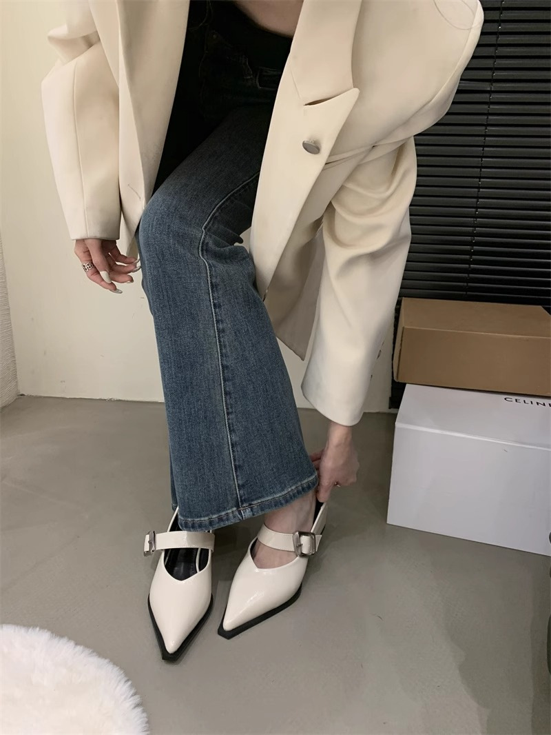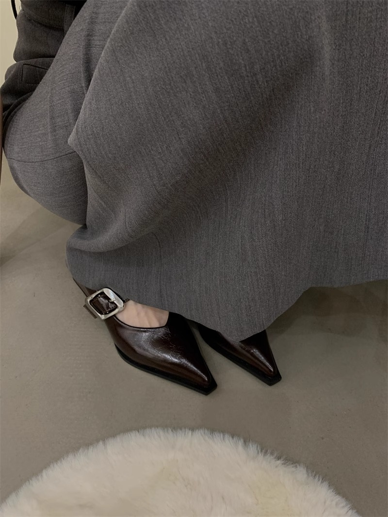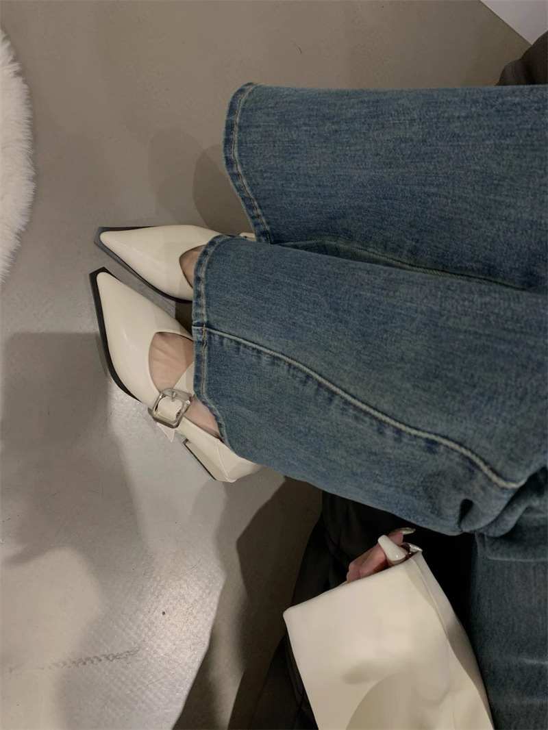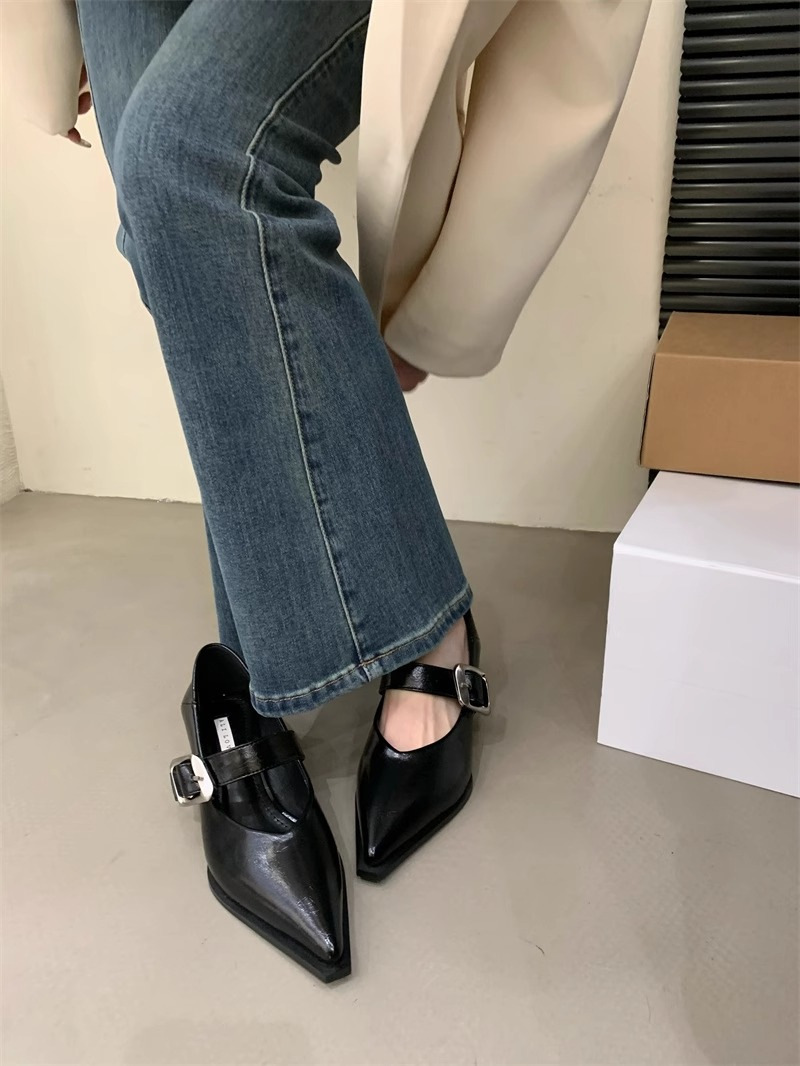여성을위한 영국 스타일 뾰족한 발가락 메리 제인 신발 2024 봄과 여름 새로운 한국 스타일 패션 복고풍 얕은 입 두꺼운 굽 작은 가죽 신발