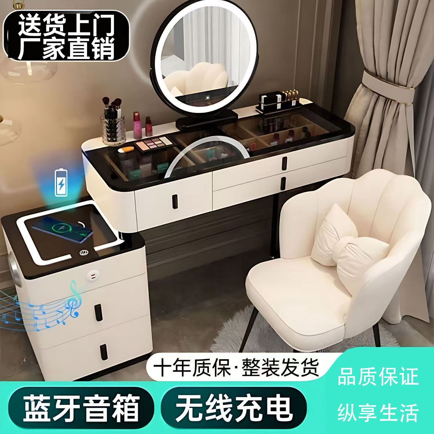 • 화이트 100.7 테이블 + 다기능 캐비닛 + 스마트 거울 + 새둥지 스툴