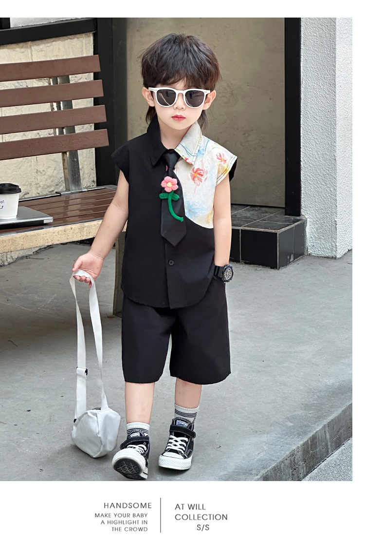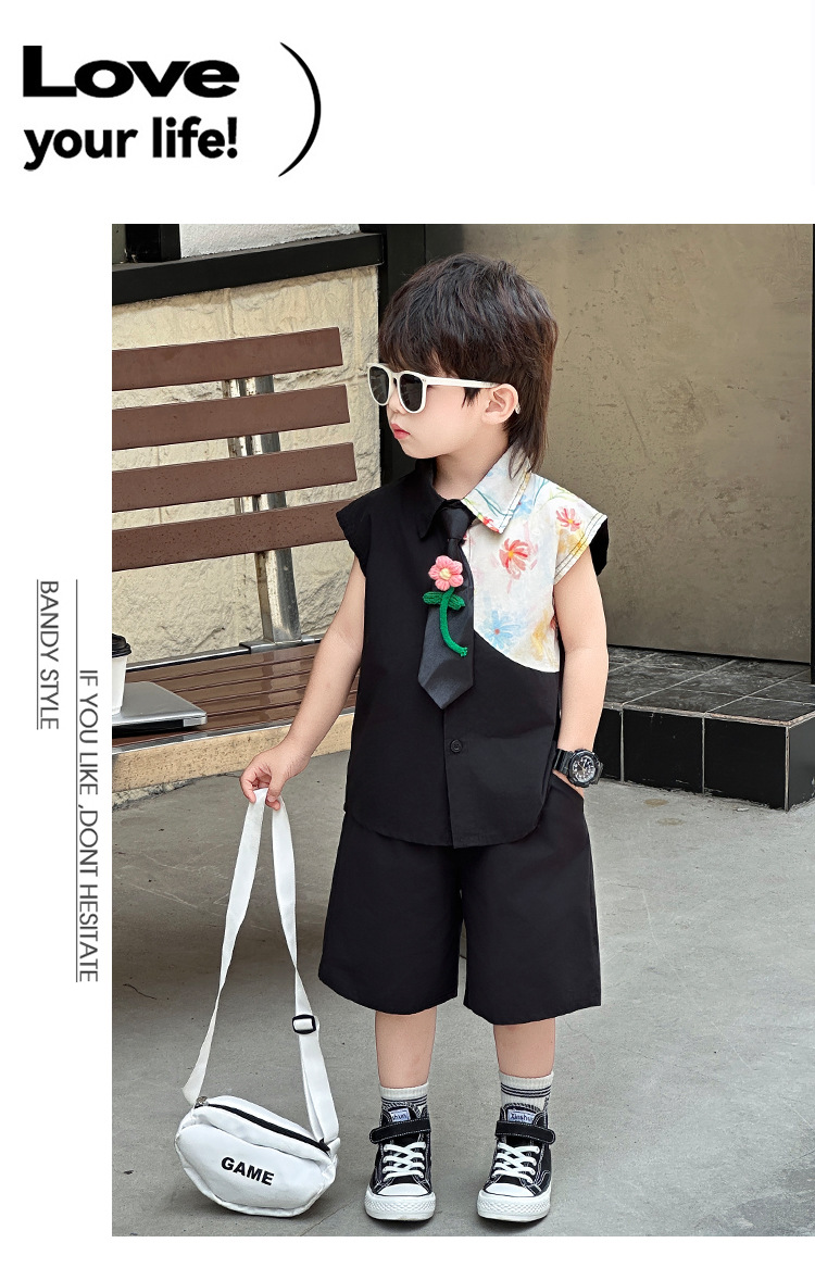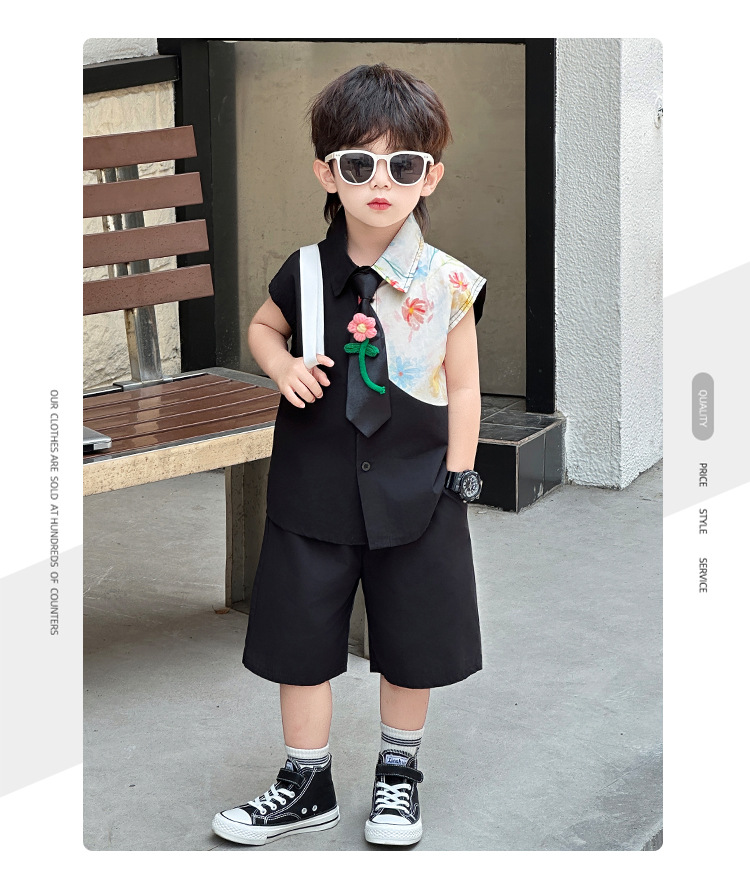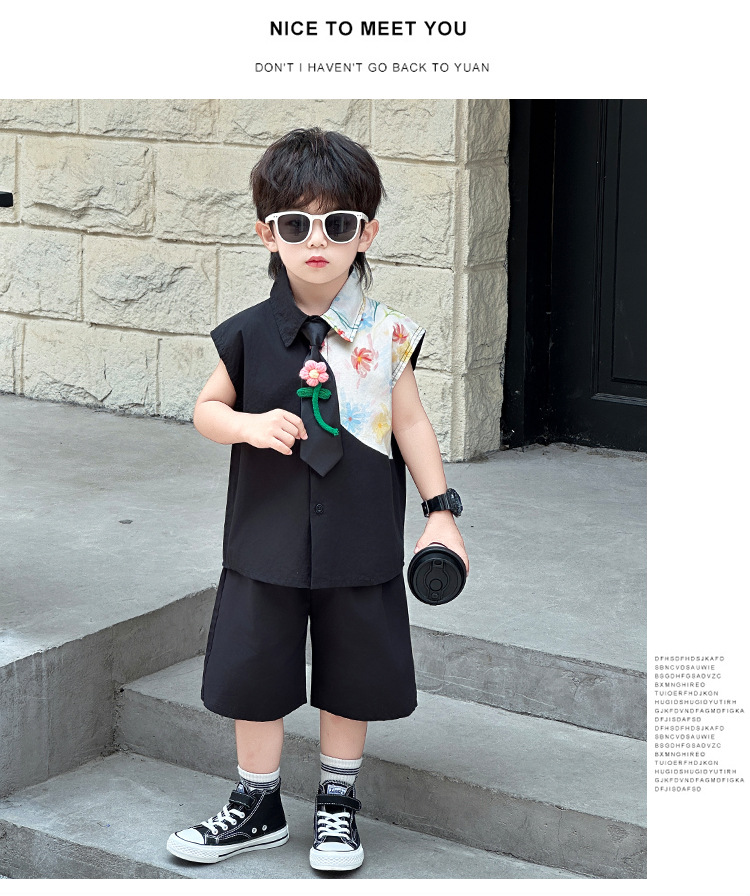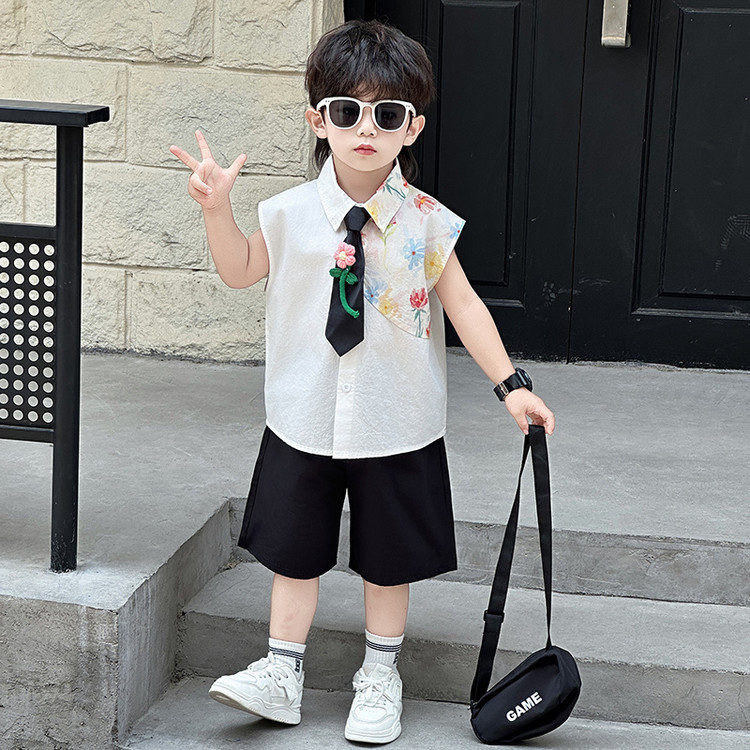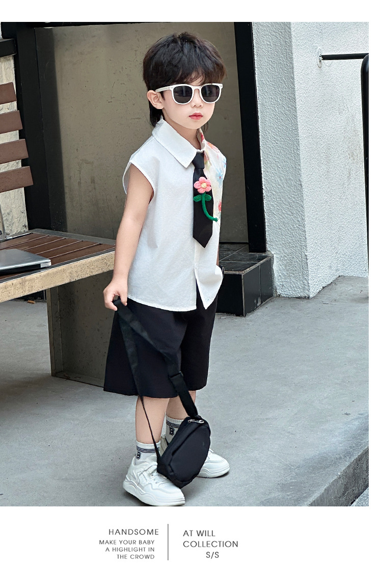 남아용 넥타이, 민소매 배색 셔츠 정장, 여름옷, 아동용 멋쟁이 셔츠 투피스 세트, 아기 멋쟁이 옷, 멋쟁이 옷스토어 가기