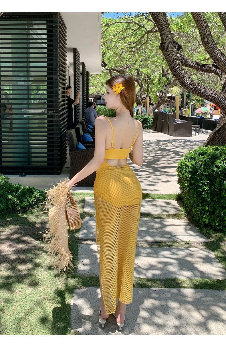 여성용 수영복 2025 새로운 스타일 노란색 서스펜더 원피스 슬리밍 비키니 아름다운 롱 스커트 비치 휴가 스타일스토어 가기