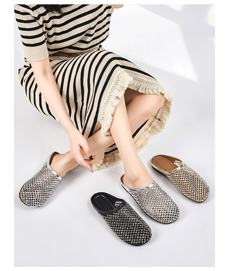 여성을위한 바오 터우 슬리퍼 2025 여름 새로운 스타일 라인 석 통기성 메쉬 중공 외부 착용 하프 슬리퍼 여성 캐주얼 플랫 여성 신발