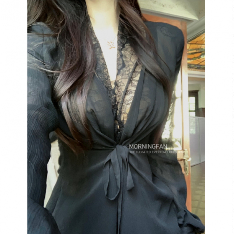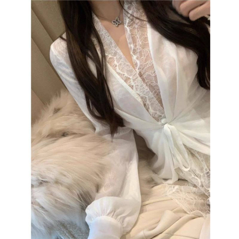 여성을위한 프랑스 스타일 부드러운 칼라 쉬폰 레이스 셔츠 봄 달콤하고 세련된 긴팔 요정 셔츠 탑