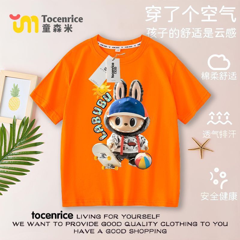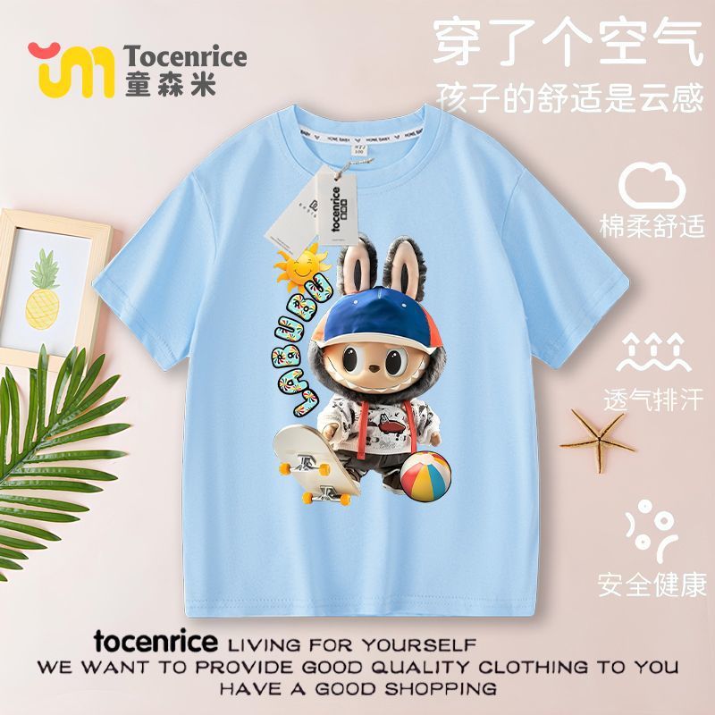 Bubble Mart 어린이 반팔 티셔츠 Labubu 소년과 소녀 여름 순수 코튼 루즈 캐주얼 운동복 아동 티셔츠