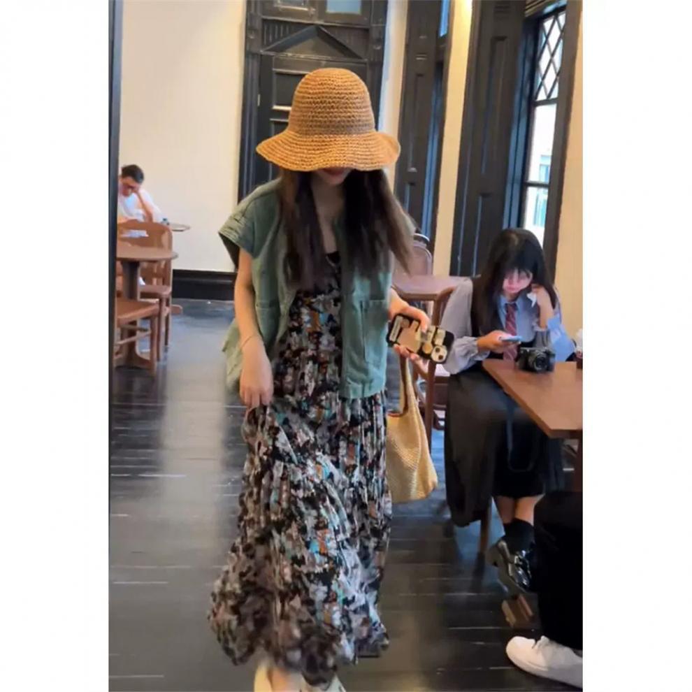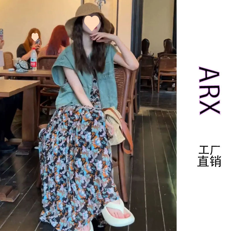 여름옷은 캐주얼하고 패셔너블하며 생기 있고 나이를 줄여주는 블루 데님 재킷과 꽃무늬 서스펜더 드레스 세트로 구성되어 있습니다.스토어 가기