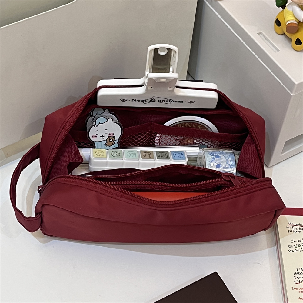 Xiaohongshu의 같은 스타일 버건디 플립 연필 가방 학생 스타일 고가치 대용량 문구 보관 연필 가방