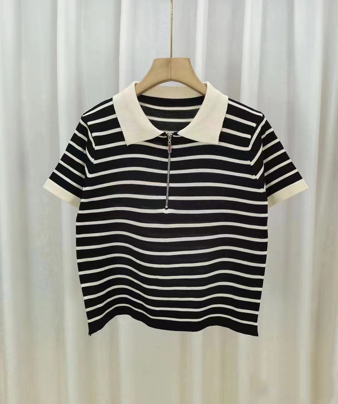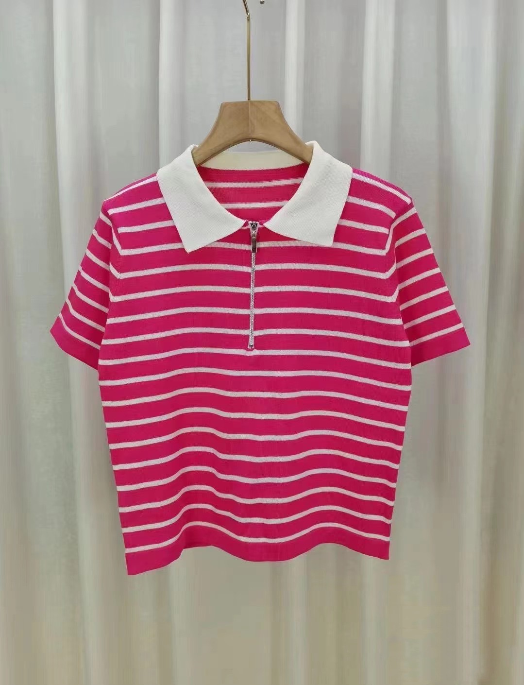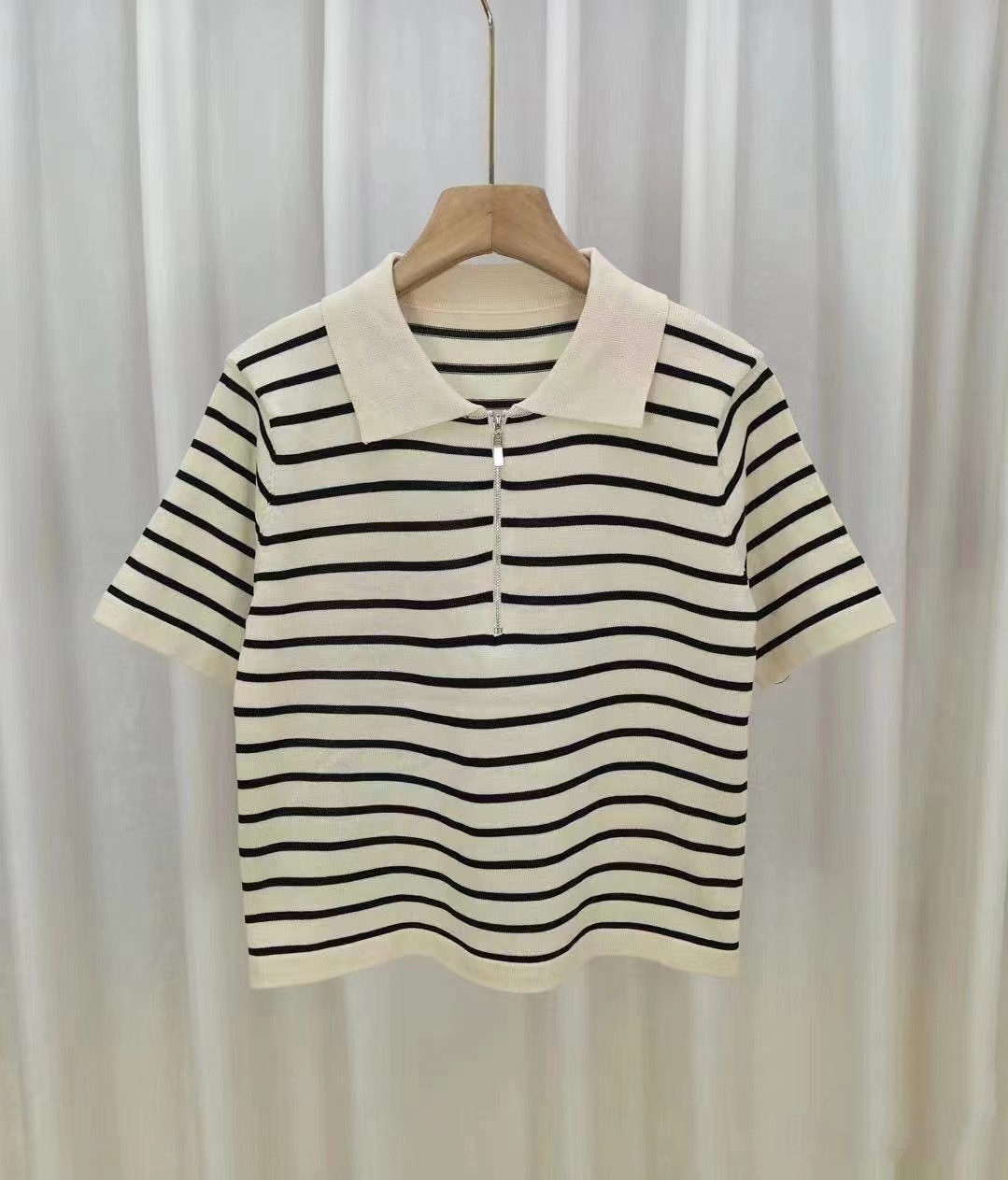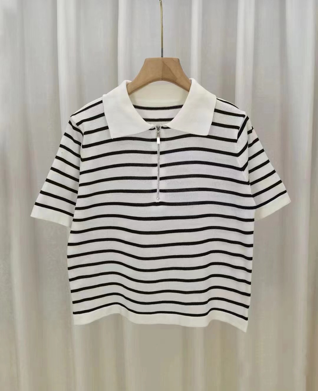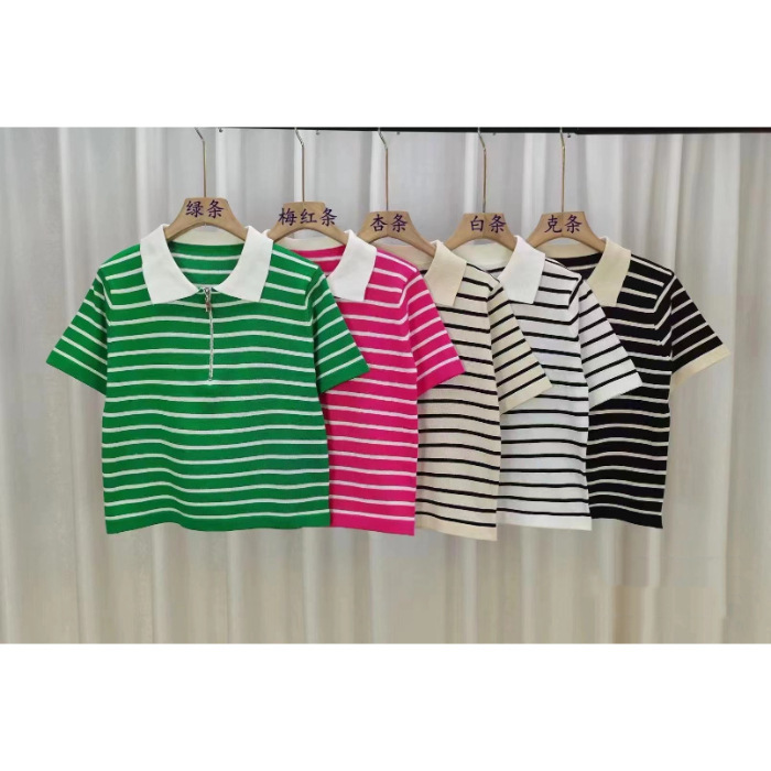 여름 여성을 위한 대비되는 색상의 복고풍 줄무늬 루즈한 라펠 스웨터 새로운 디자인 서양식 지퍼 다용도 탑 트렌디스토어 가기