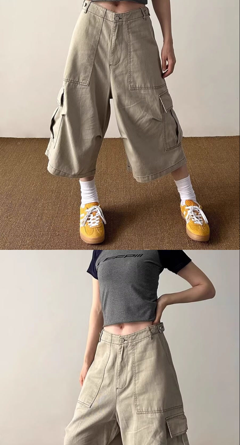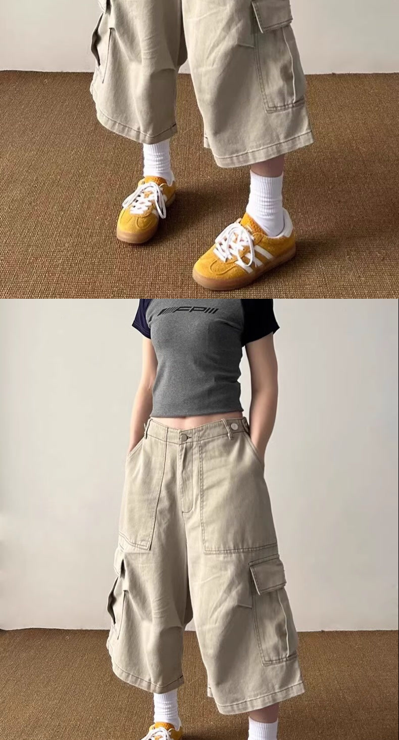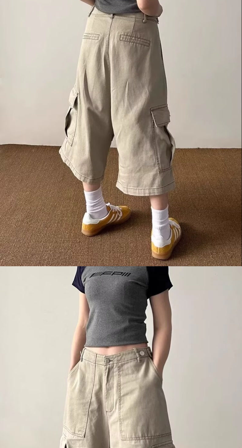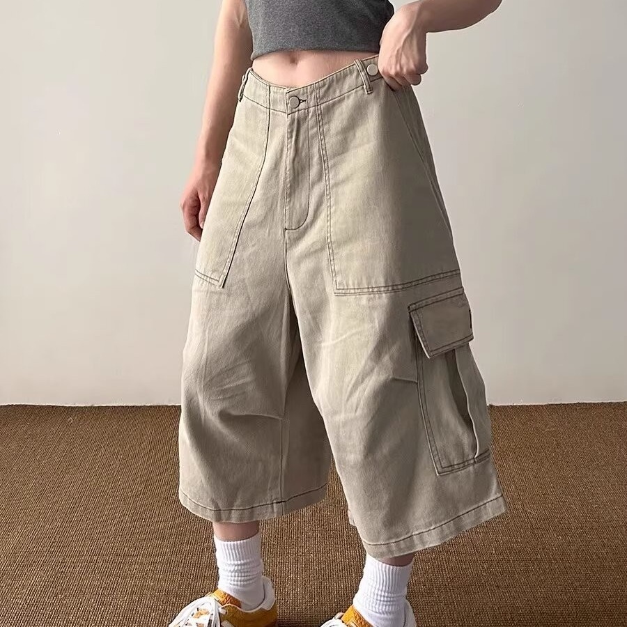 2025 여름 홍콩 스타일 스트리트 플리츠 멀티 포켓 바지 여성용 다용도 루즈 스트레이트 캐주얼 작업복 7부 반바지 트렌디스토어 가기