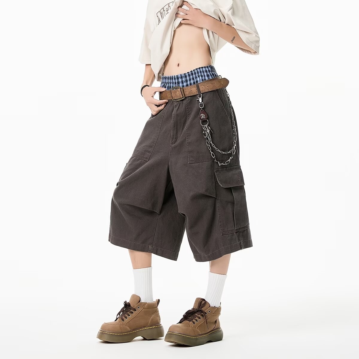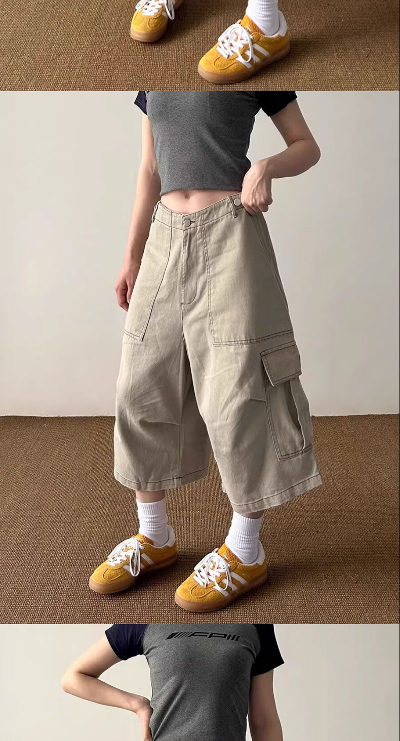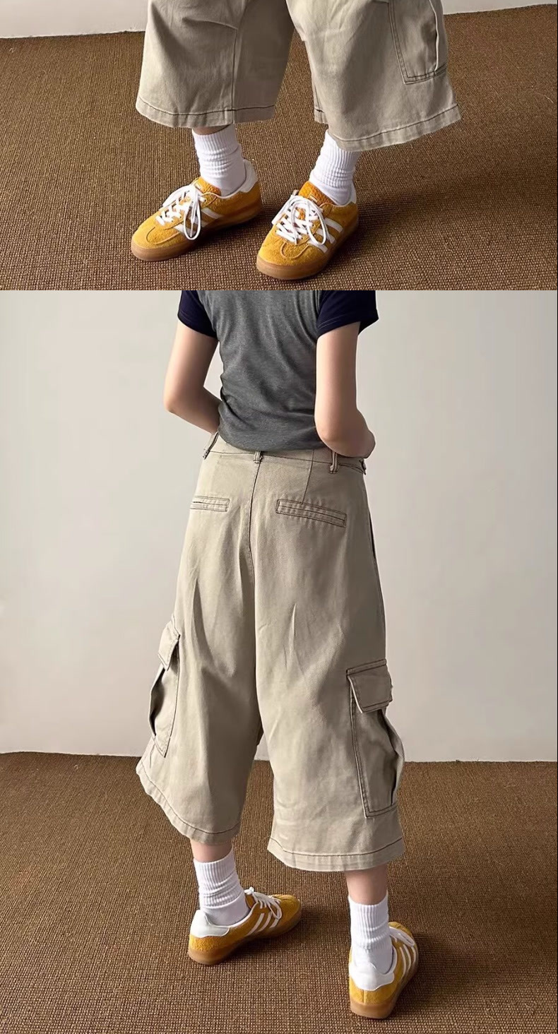 2025 여름 홍콩 스타일 스트리트 플리츠 멀티 포켓 바지 여성용 다용도 루즈 스트레이트 캐주얼 작업복 7부 반바지 트렌디스토어 가기