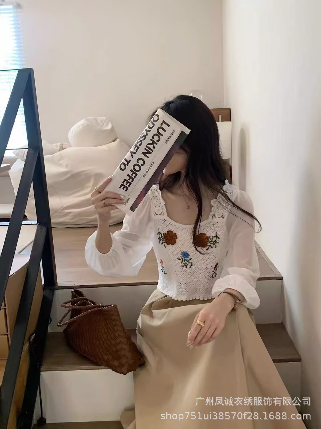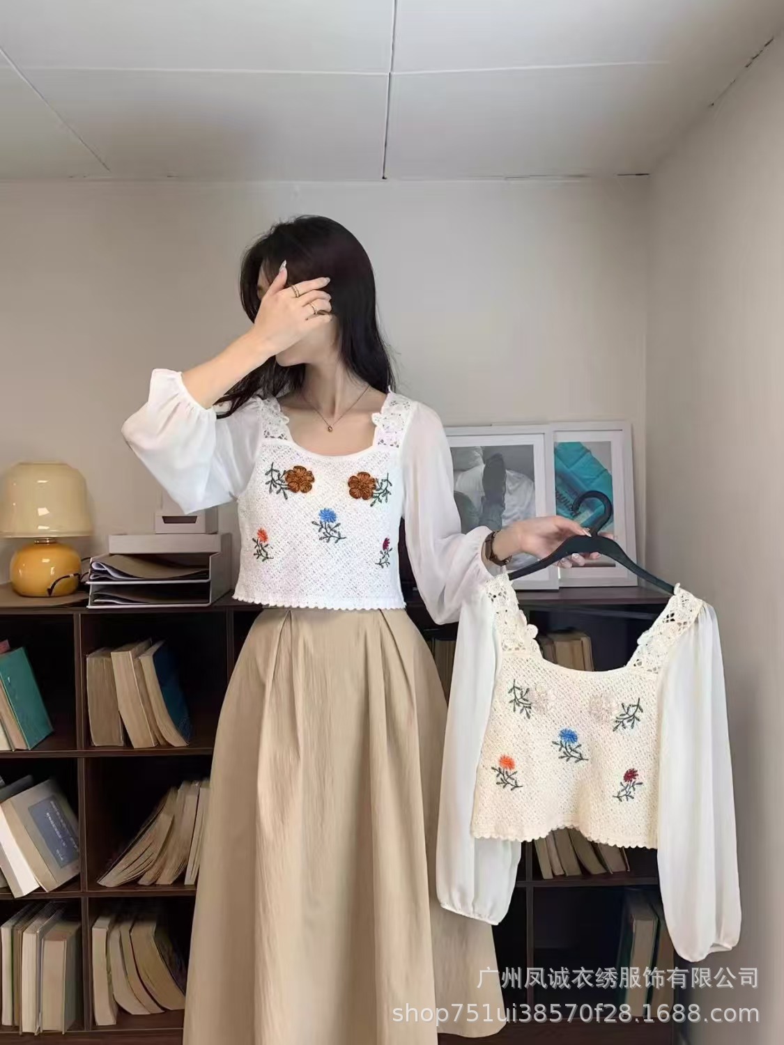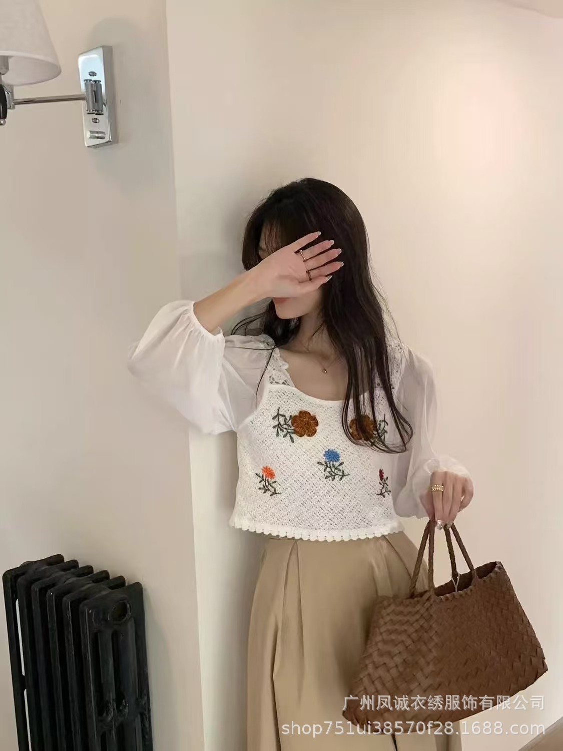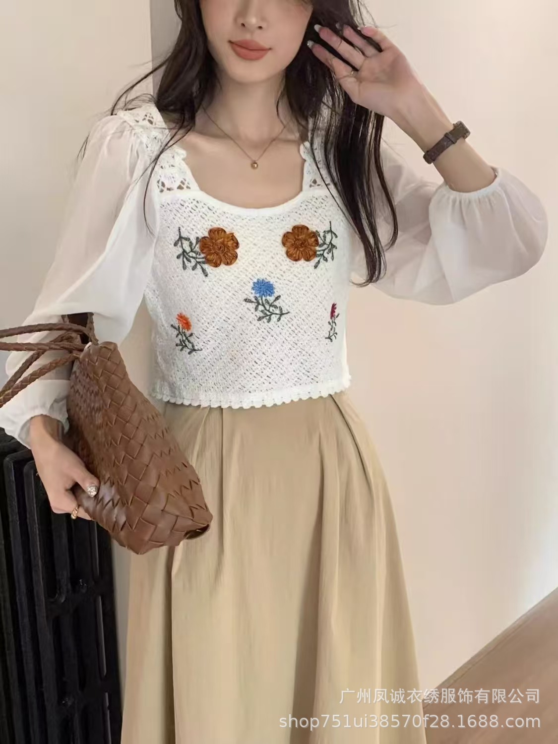 여성용 프렌치 탑 여름 얇은 쉬폰 스플 라이스 니트 디자인 틈새 프렌치 버블 긴팔 V 넥 셔츠스토어 가기