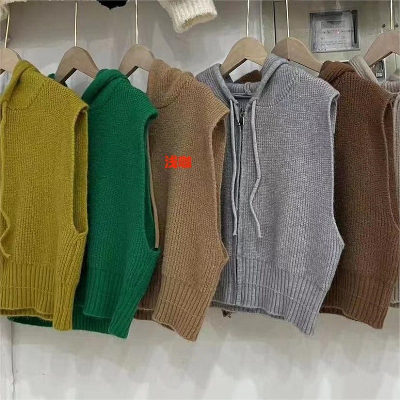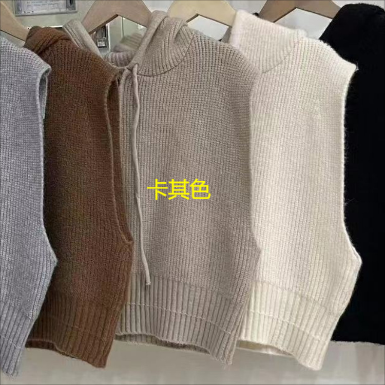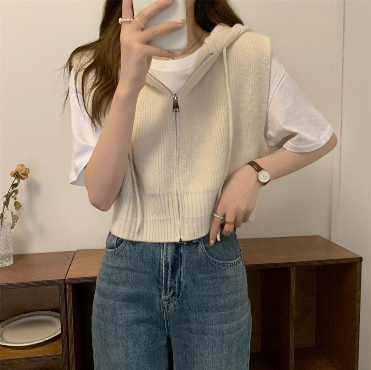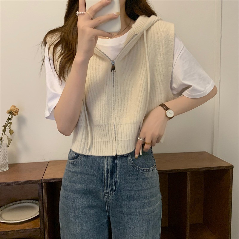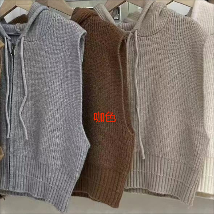 한국 스타일 복고풍 캐주얼 다목적 솔리드 컬러 여성용 탑 지퍼 드로스트링 후드 초가을 여성용 니트 조끼스토어 가기