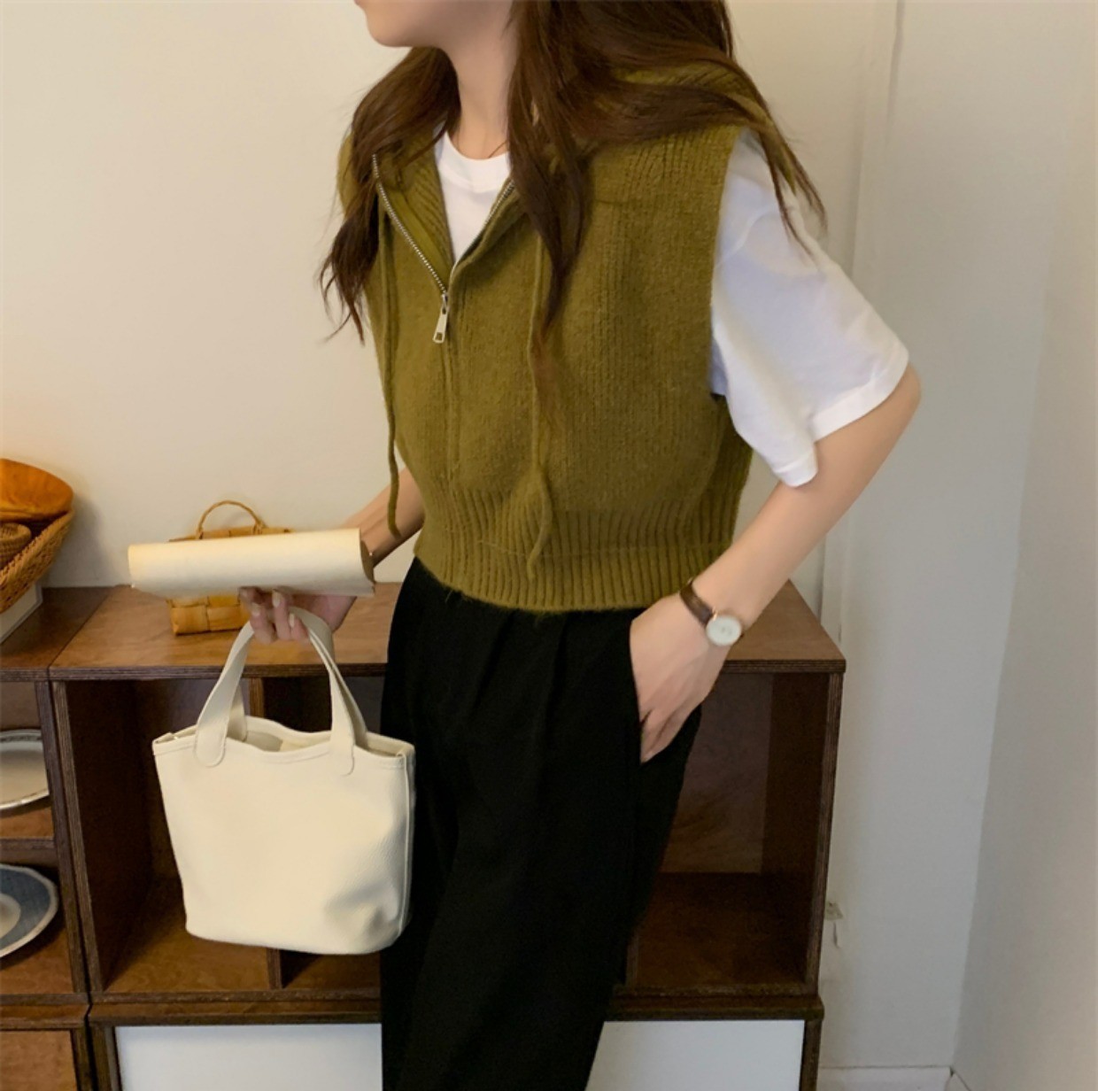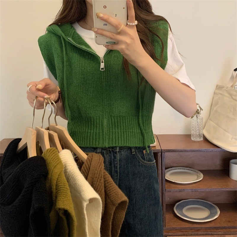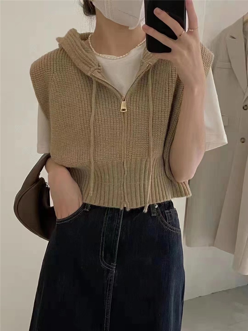 한국 스타일 복고풍 캐주얼 다목적 솔리드 컬러 여성용 탑 지퍼 드로스트링 후드 초가을 여성용 니트 조끼