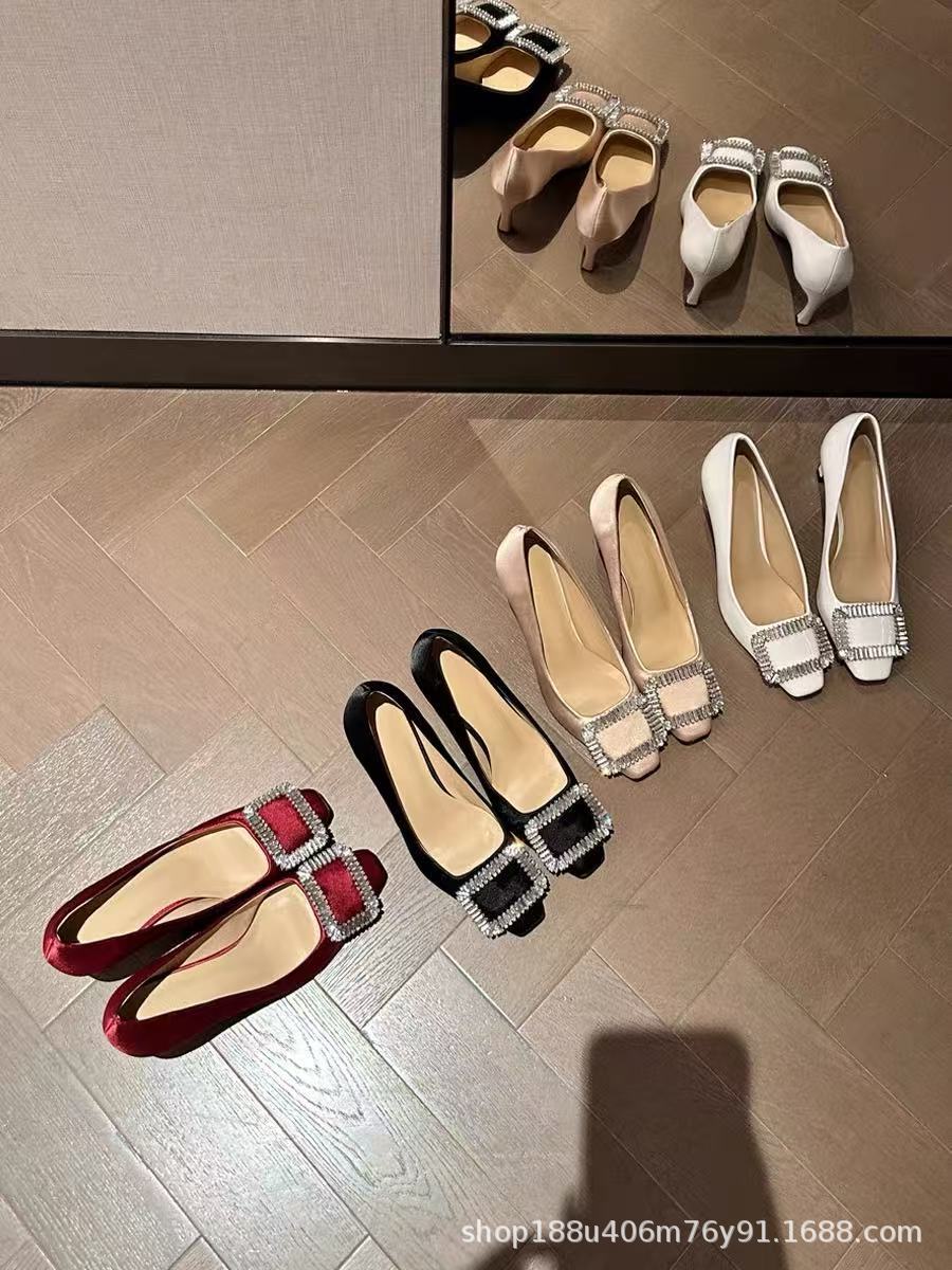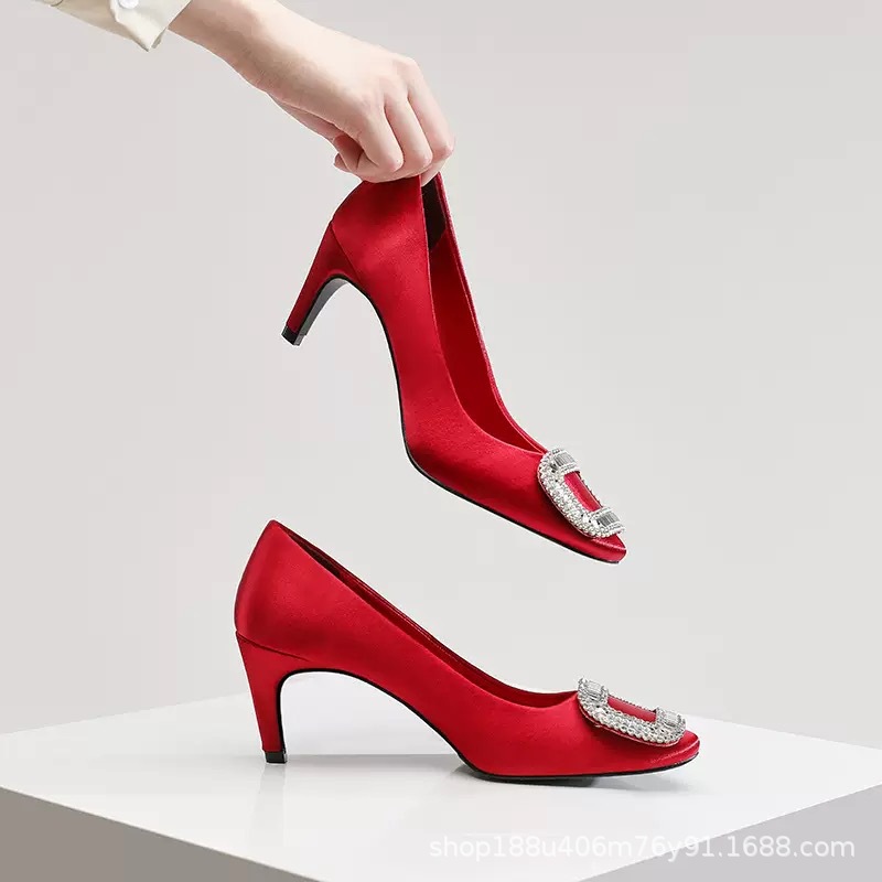 Royeer Viuoar 클래식 이른 봄 새로운 RV 실크 새틴 라인 석 싱글 신발 여성 결혼식 신발 펌프 하이힐 스퀘어 발가락